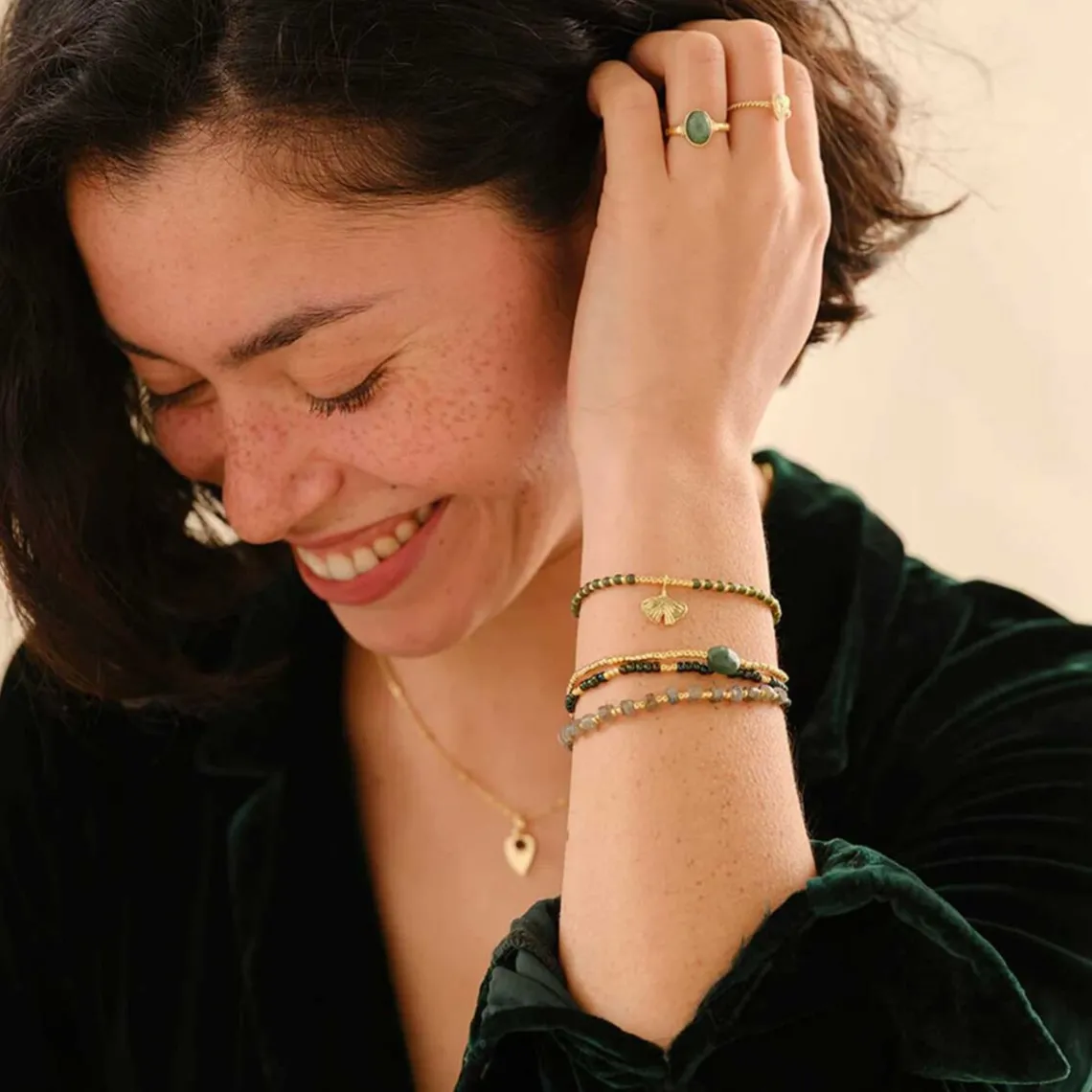 Oplev det smukke Hoping Labradorite armbånd, der kombinerer glasperler og guldfarvede perler med en guldbelagt charm og en lille rund labradoritsten. Armbåndet lukkes med en justerbar slidknude af bomuldstråd med messingperler og passer til håndled fra 16 til 20 cm. Labradorit hjælper dig med at følge din intuition.