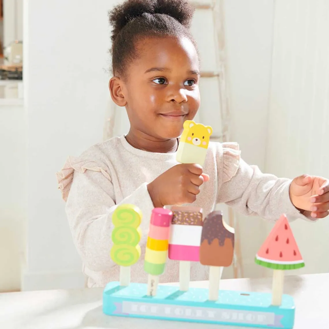 Isene kan tages op af holderen og viser en sød lille besked (engelsk) skrevet på den ellers skjulte del af pinden Materiale: Træ