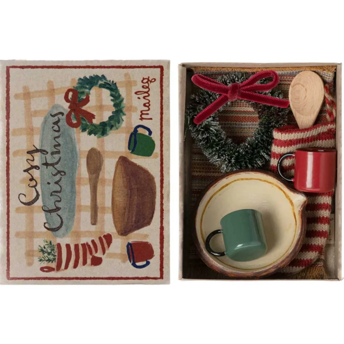 I den smukke gaveæske finder du en lille strømpe, et tæppe, en krans, to kopper og en skål med træske.