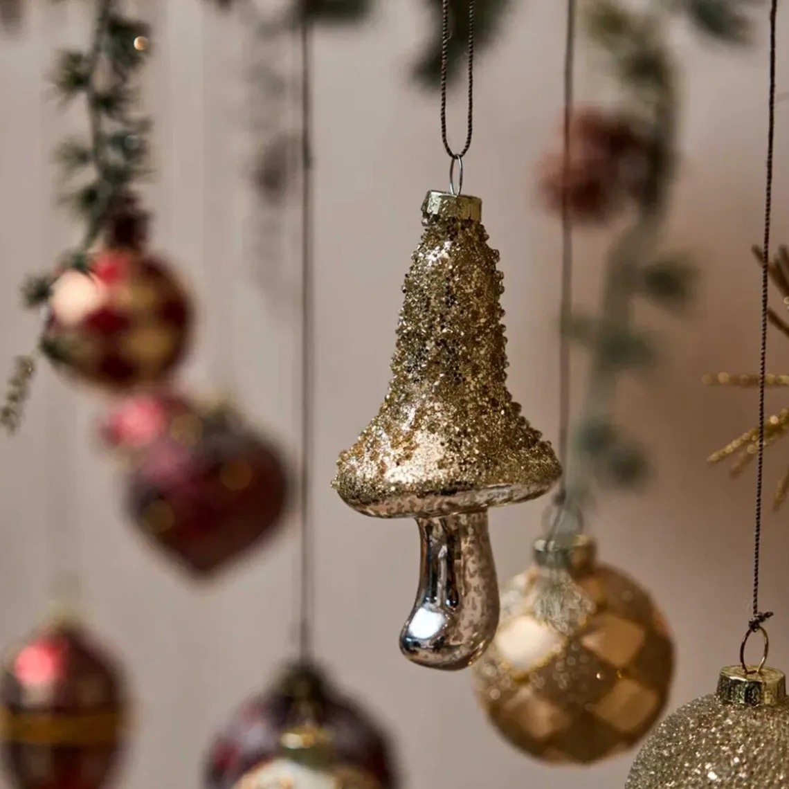 Sød julekugle formet som en svamp, perfekt til at tilføje et legende og hyggeligt touch til juletræet eller dekorationer. Dimension: L: 6 x B: 6 x H: 12 cm