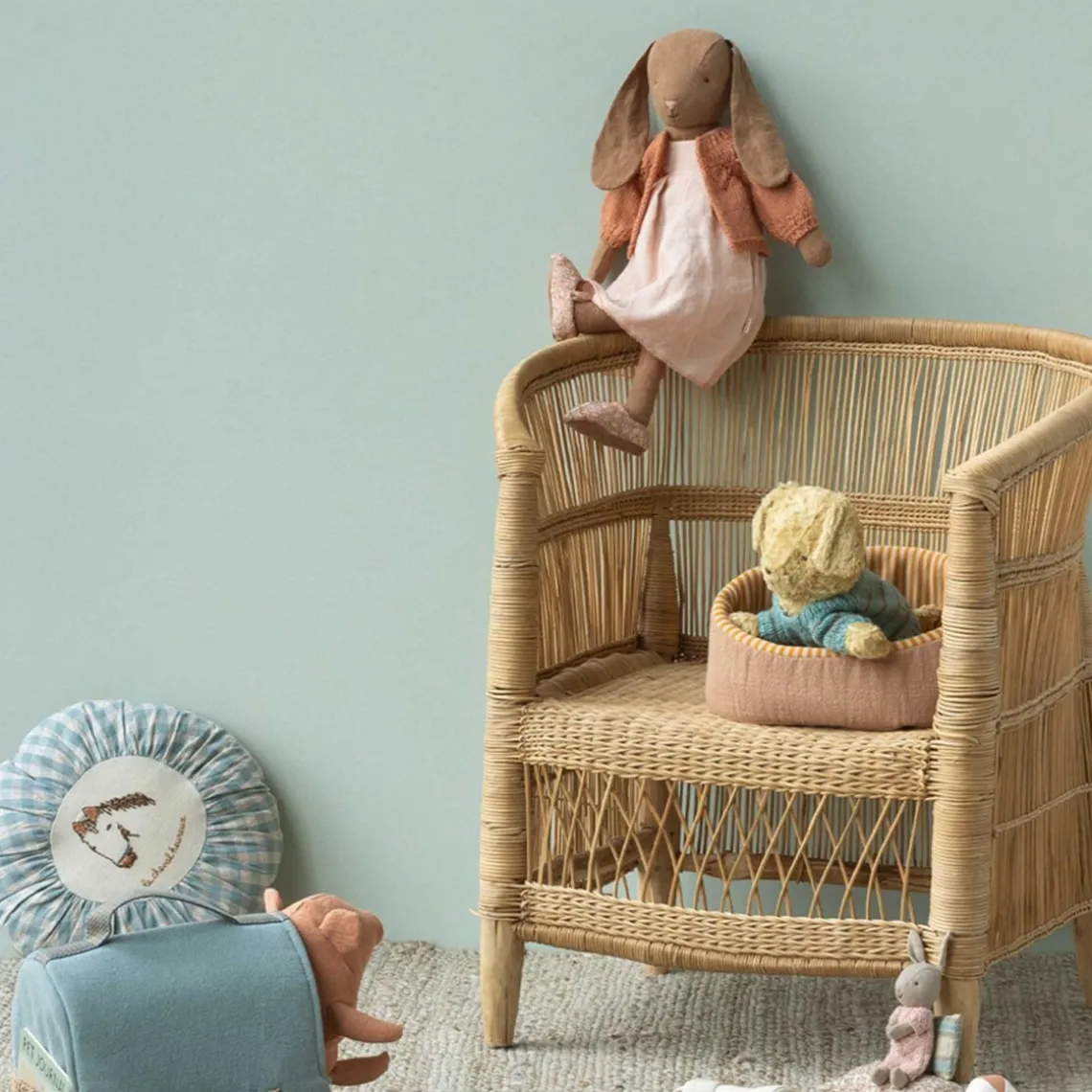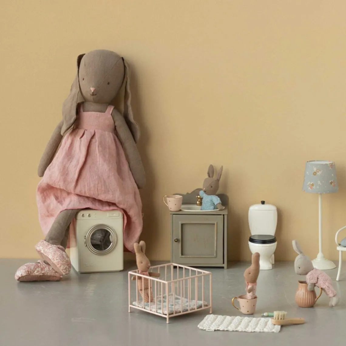 En klassisk kanin i naturligt stof, blød at røre ved og charmerende at se på. Hun er iklædt en smuk kjole og bløde sko, hvilket giver hende et elegant og tidløst udtryk. Mål: H52 cm