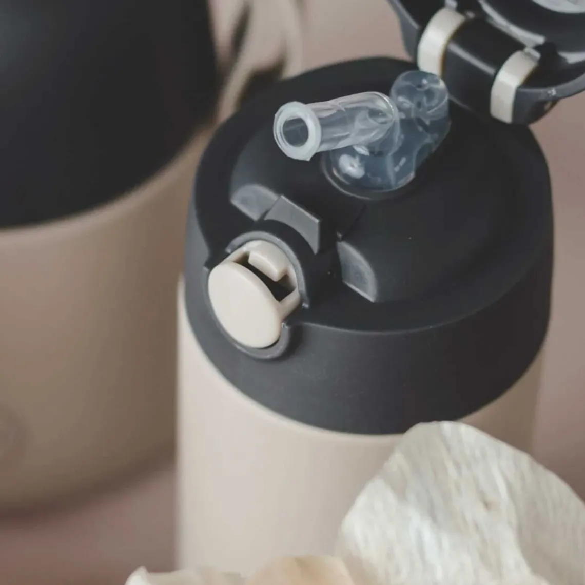 Drikkeflasken har et unikt låg der åbnes med et let tryk på knappen. I låget sidder et blødt sugerør, som er skånsomt for deres små tænder.
