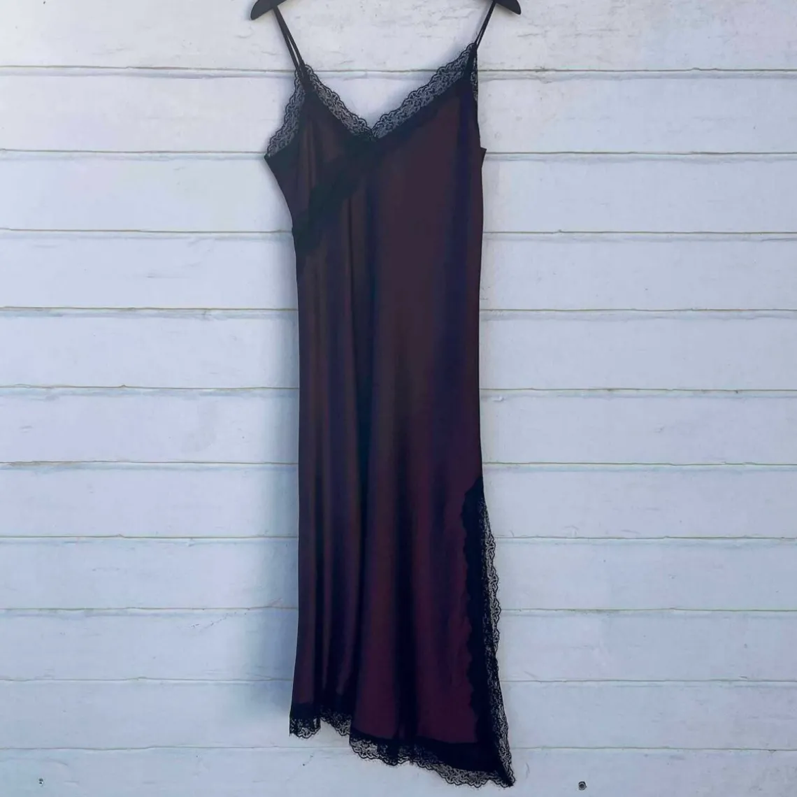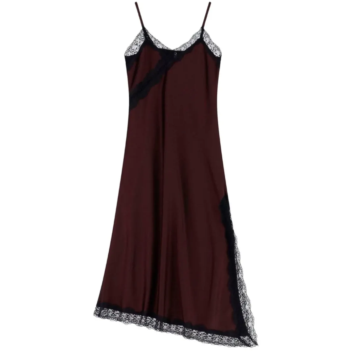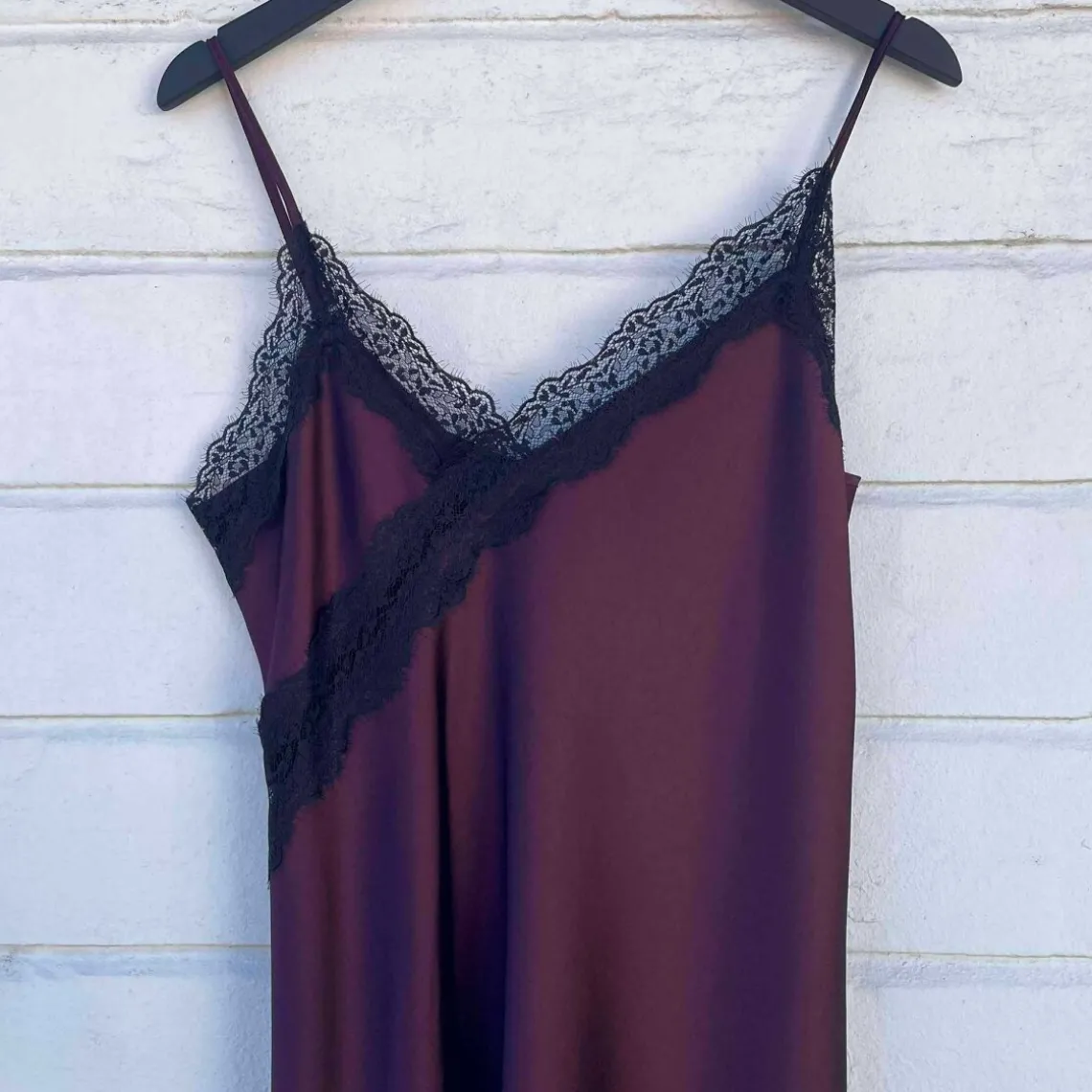 Smuk kjole fra Imperial i en dyb bordeaux farve. Kjolen har justerbare stropper. Udskæringen foran er en asymmetrisk v-udskæring. Rygudskæringen er lige. Bunden af kjole er også asymmetrisk. Kjolen er pyntet med flotte sort blondedetaljer ved brystet og kanten samt langs et slids i venstre side.