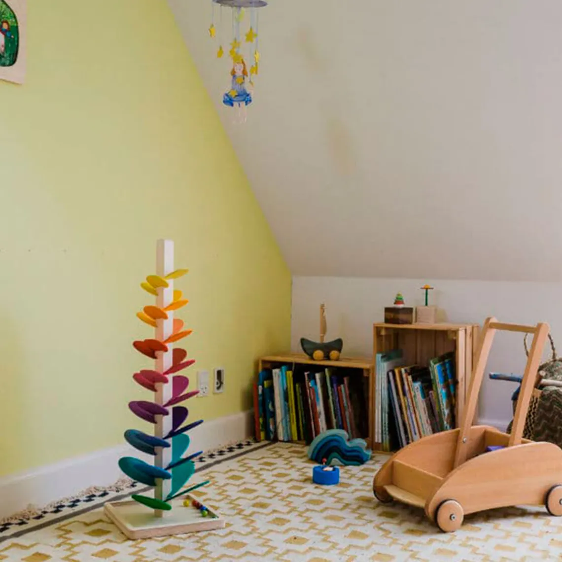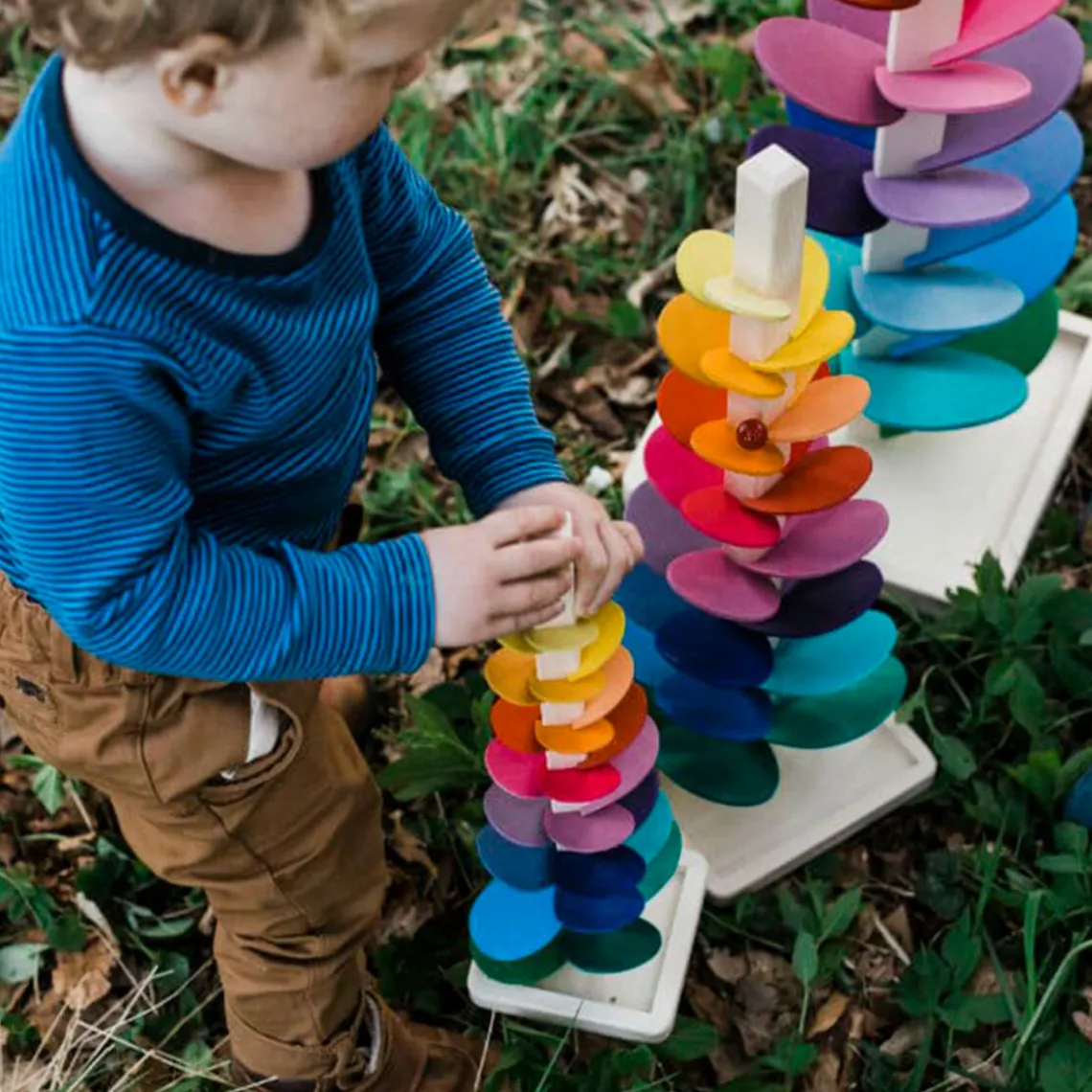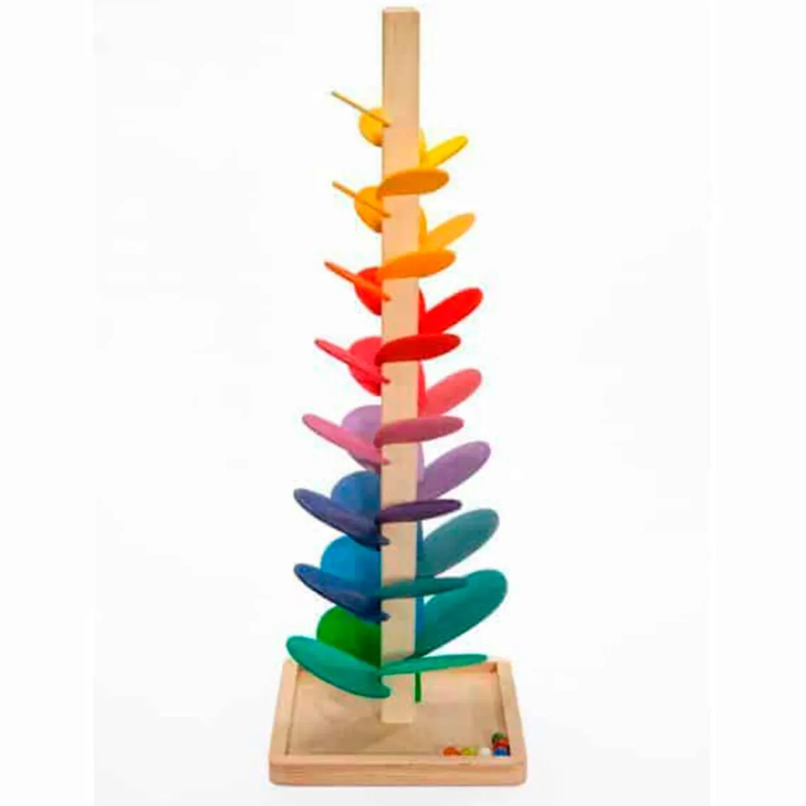 Smukt klangtræ med seks kugler i forskellige farver, der giver den mest fantastiske, lille, fine lyd, når kuglerne triller ned ad de farverige blade.