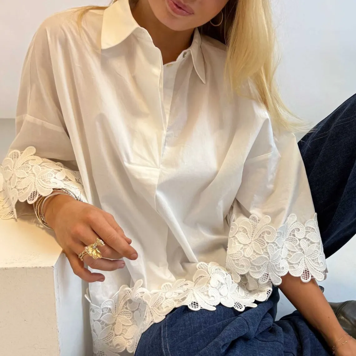 Hvid bluse med delikate broderidetaljer og let, luftig kvalitet. Løst snit med feminine ærmer skaber et elegant, sofistikeret look – perfekt til både hverdag og mere formelle lejligheder.