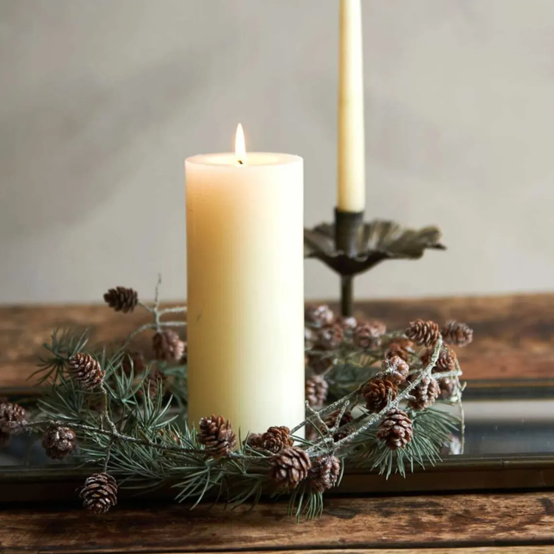 Her får du en smuk kogle guirlande som du kan bruge som pynt. Du kan f.eks. have den liggende på bordet, for at pynte smukt til din borddækning.
