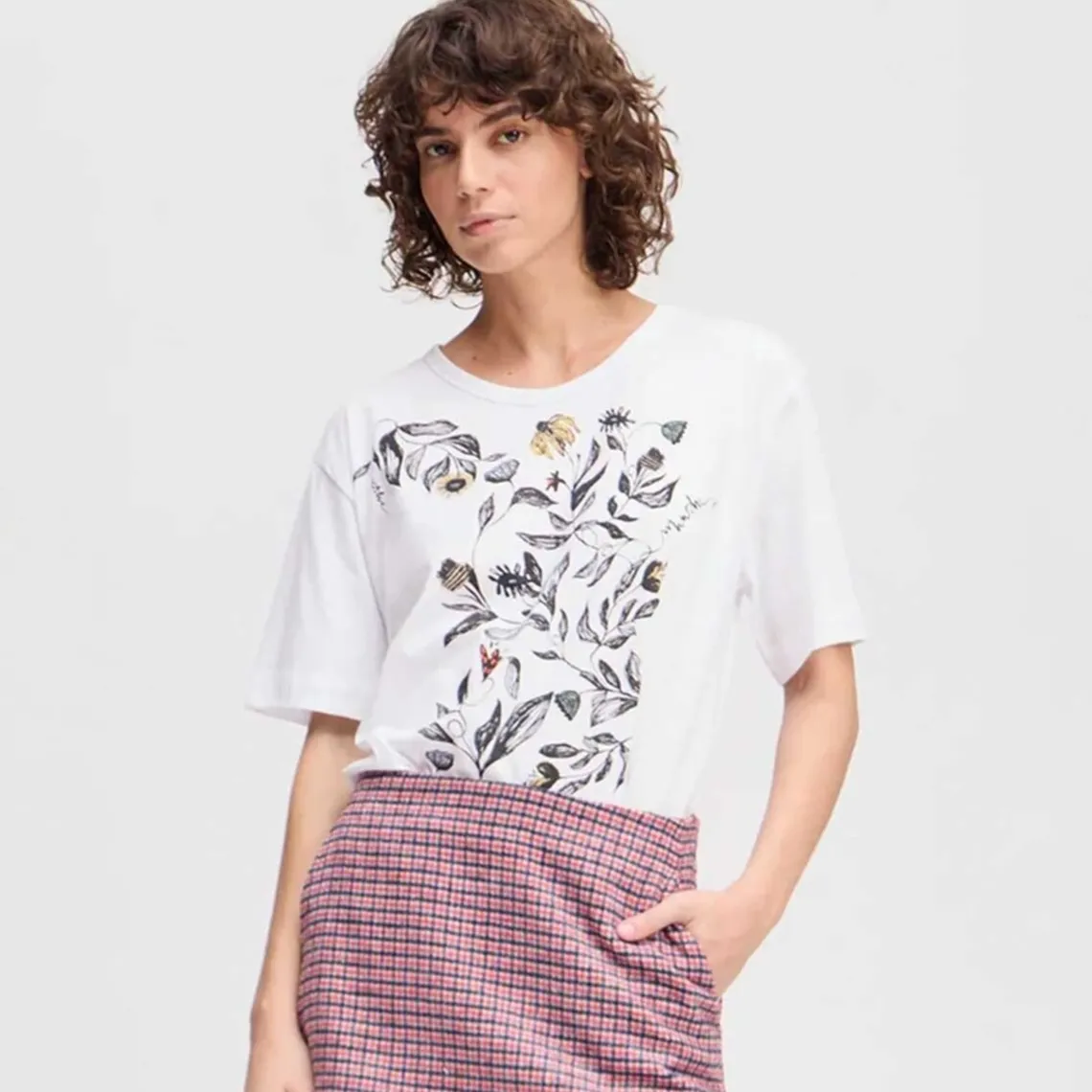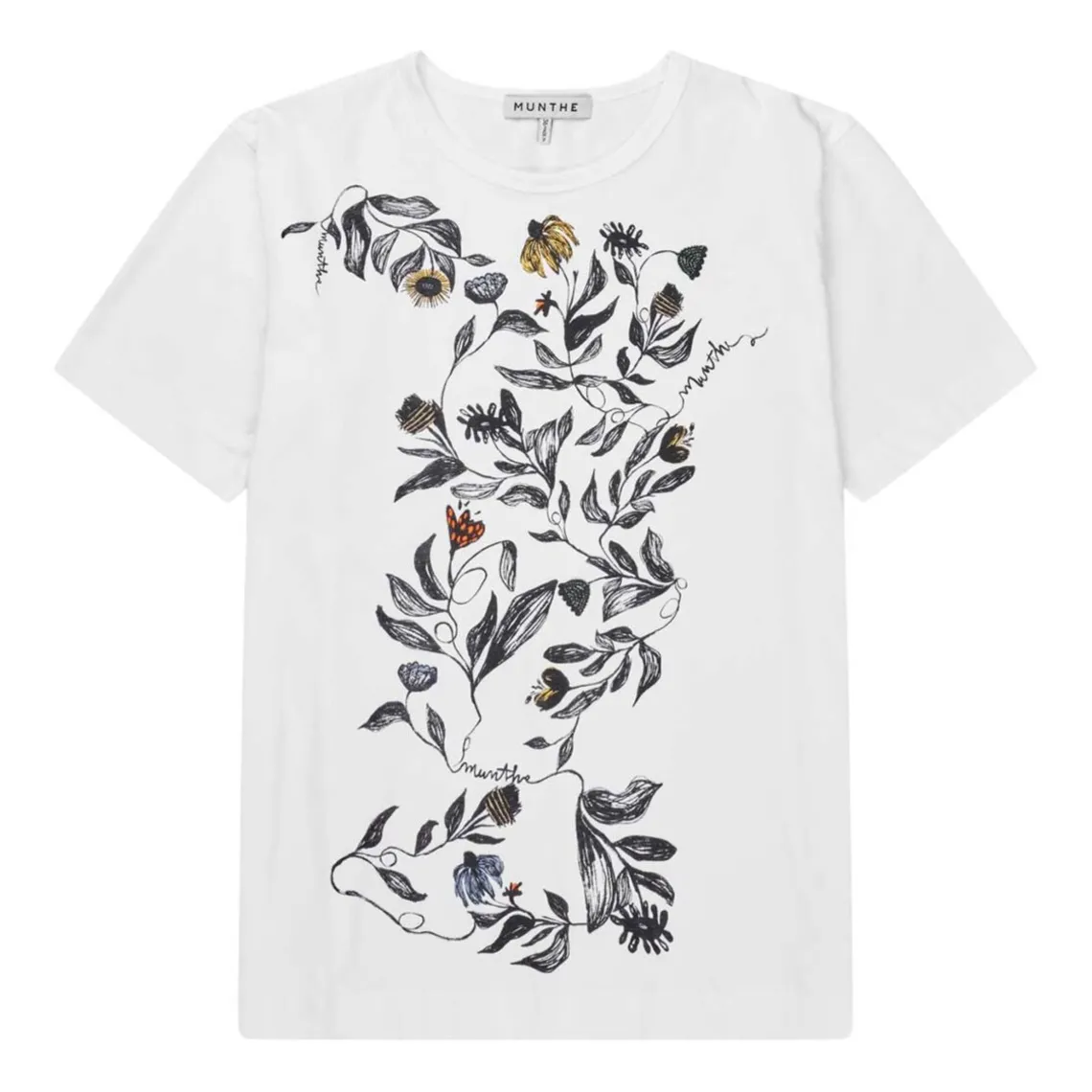 T-shirten er fremstillet i økologisk bomuld og prydet med et karakteristisk blomsterprint fra MUNTHE. Den har en rund halsudskæring og korte ærmer – perfekt til et afslappet, men stilfuldt look.