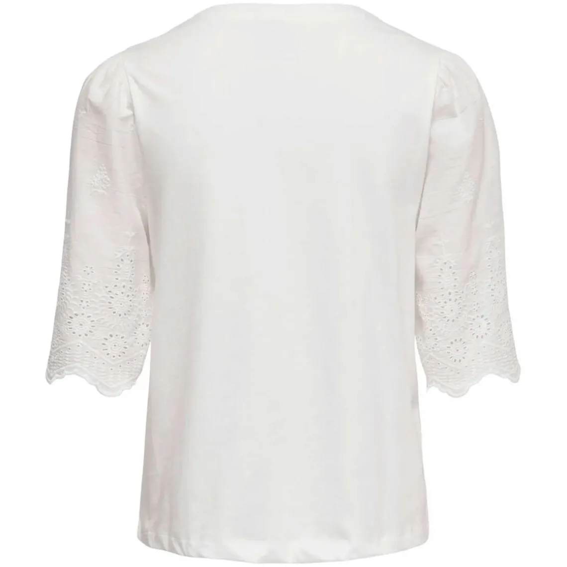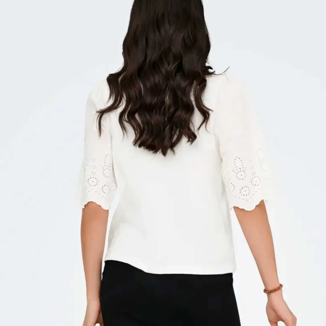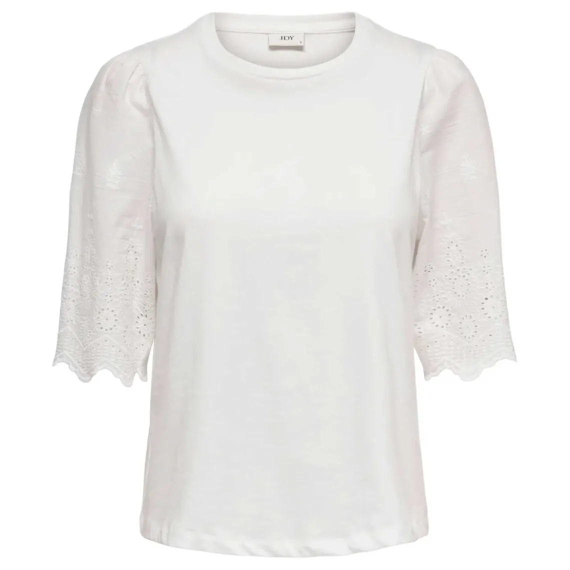 Fin og bæredygtig – denne top fra JDY er lavet af blød, økologisk bomuld og kombinerer komfort med delikate detaljer. De korte ærmer er pyntet med broderi, og den klassiske runde hals giver et tidløst og alsidigt look, perfekt til både hverdagsbrug og lag-på-lag styling.