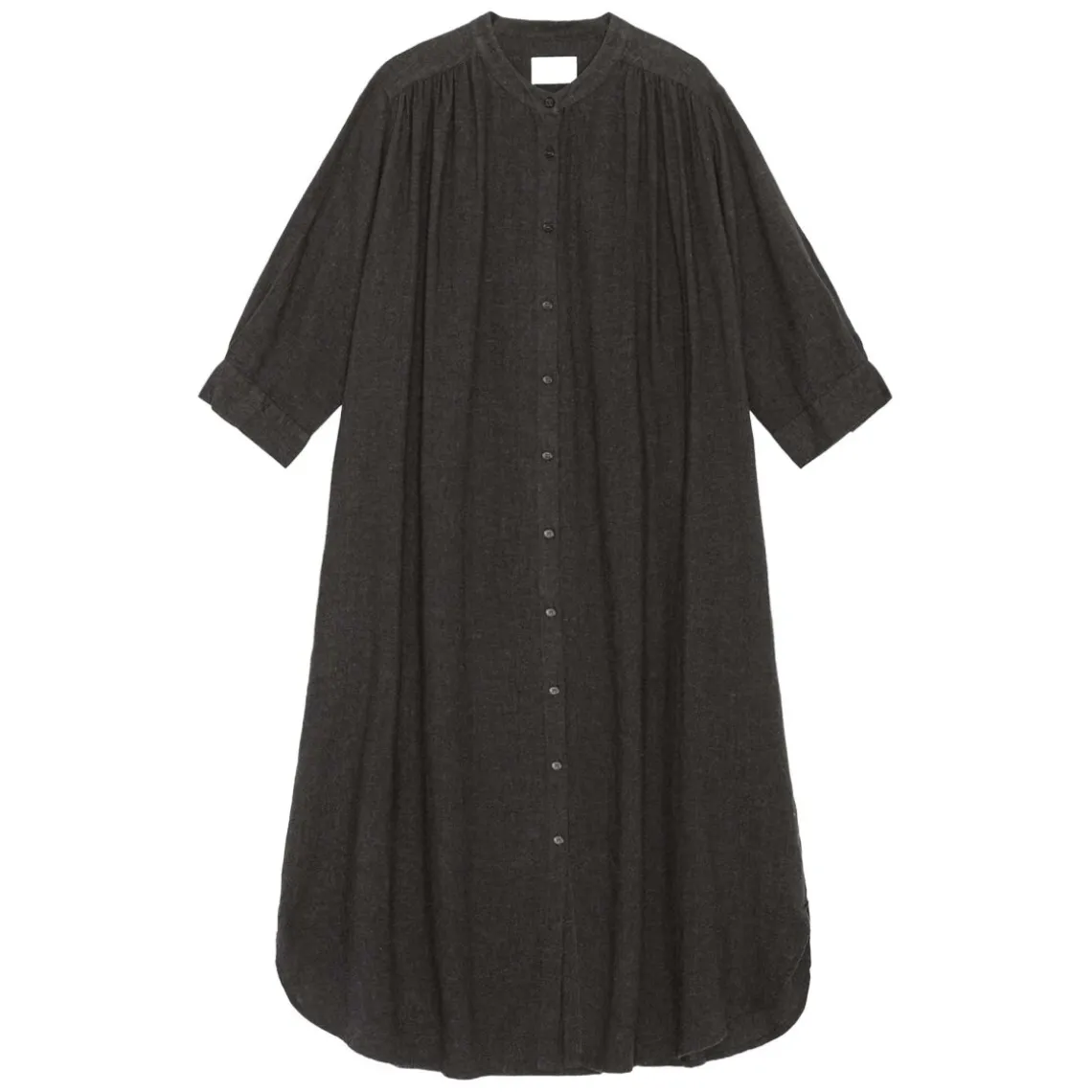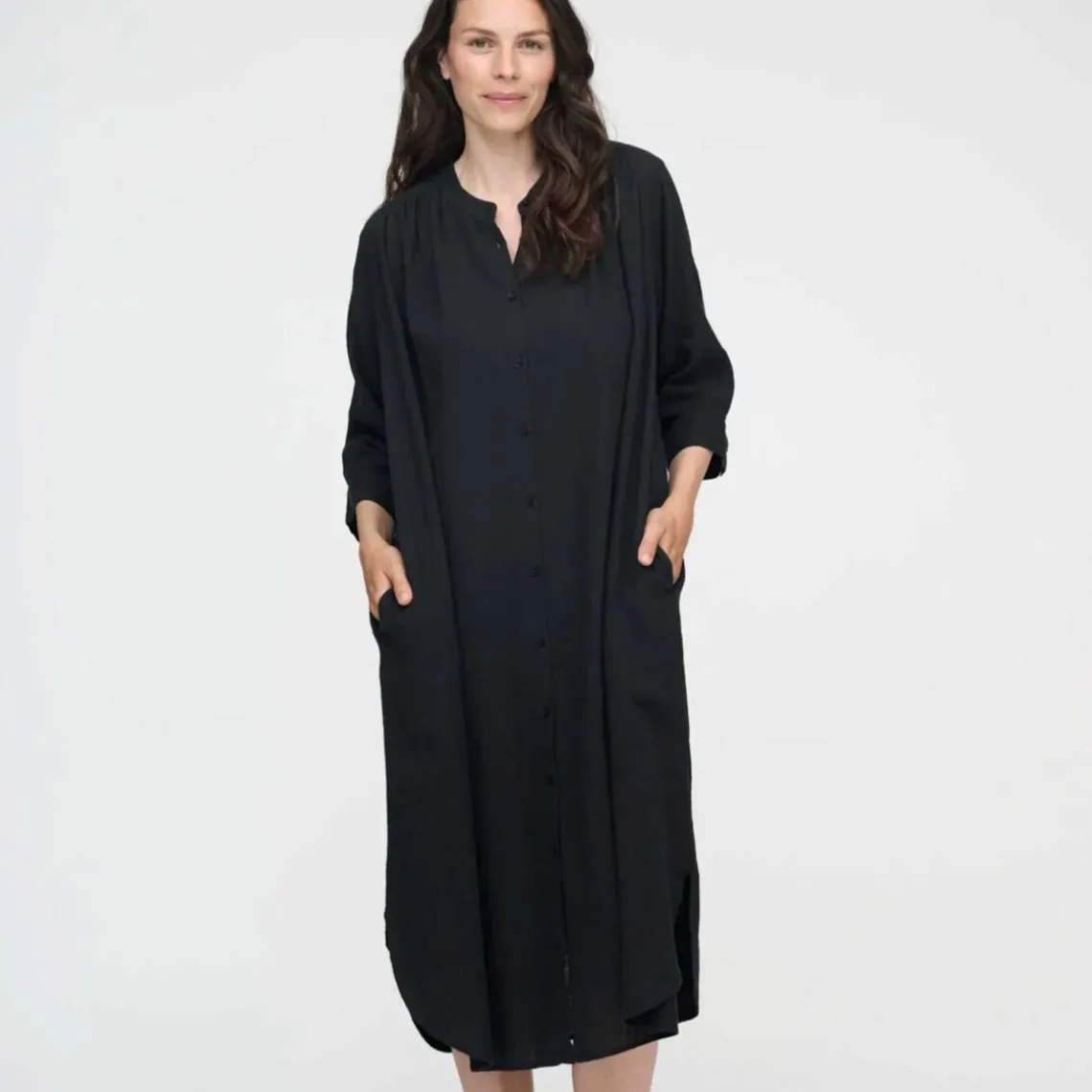Lang, mørkegrå skjortekjole i et løst og behageligt fit, perfekt til både hverdag og mere afslappede anledninger. Kjolen har trekvart ærmer, knaplukning foran og diskrete plisseringer ved skuldrene både foran og bagtil, hvilket skaber et elegant fald. Den afrundede bundsøm giver kjolen et blødt og feminin finish.