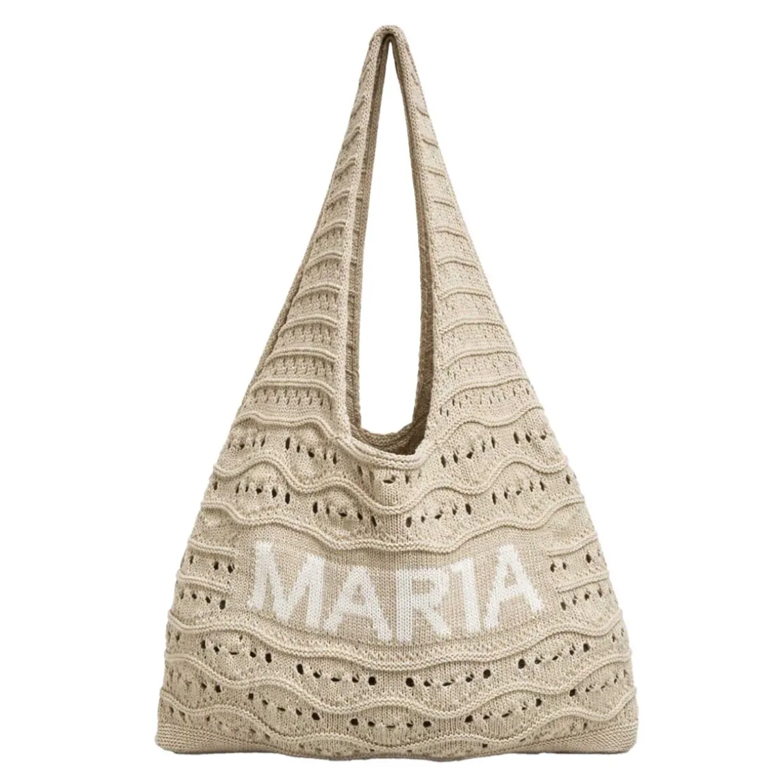 Strikket taske med bølgemønster og fine, små huldetaljer, der giver et let og dekorativt udtryk. Tasken er perfekt som hverdags- eller weekendtaske og tilføjer et feminint touch til ethvert outfit. Materiale: 50% bomuld, 50% akryl