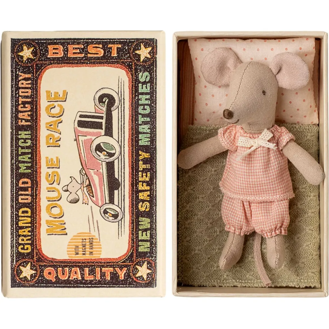 Maileg lillesøster mus i tændstikæske er en sød og lille figur, der passer perfekt til Mailegs miniatureunivers. Den fine detalje og charmerende udtryk gør hende ideel til smålege og fantasifulde eventyr. En hyggelig og krammevenlig tilføjelse til samlingen.