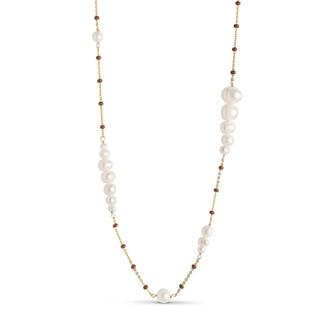 Lola Carmen findes med brune emaljekugler på kæden og med en kombination af sarte jordfarvede emaljekugler. Obs: Vær opmærksom på IKKE at bære Lola styles i bad, når du sover og for tæt på parfumer og cremer, da emaljen kan ændre farve og struktur. Kvalitet: 18 karat gold-plated 925 sterling silver (89% recycled sterling silver), Freshwater Pearls and Enamel
