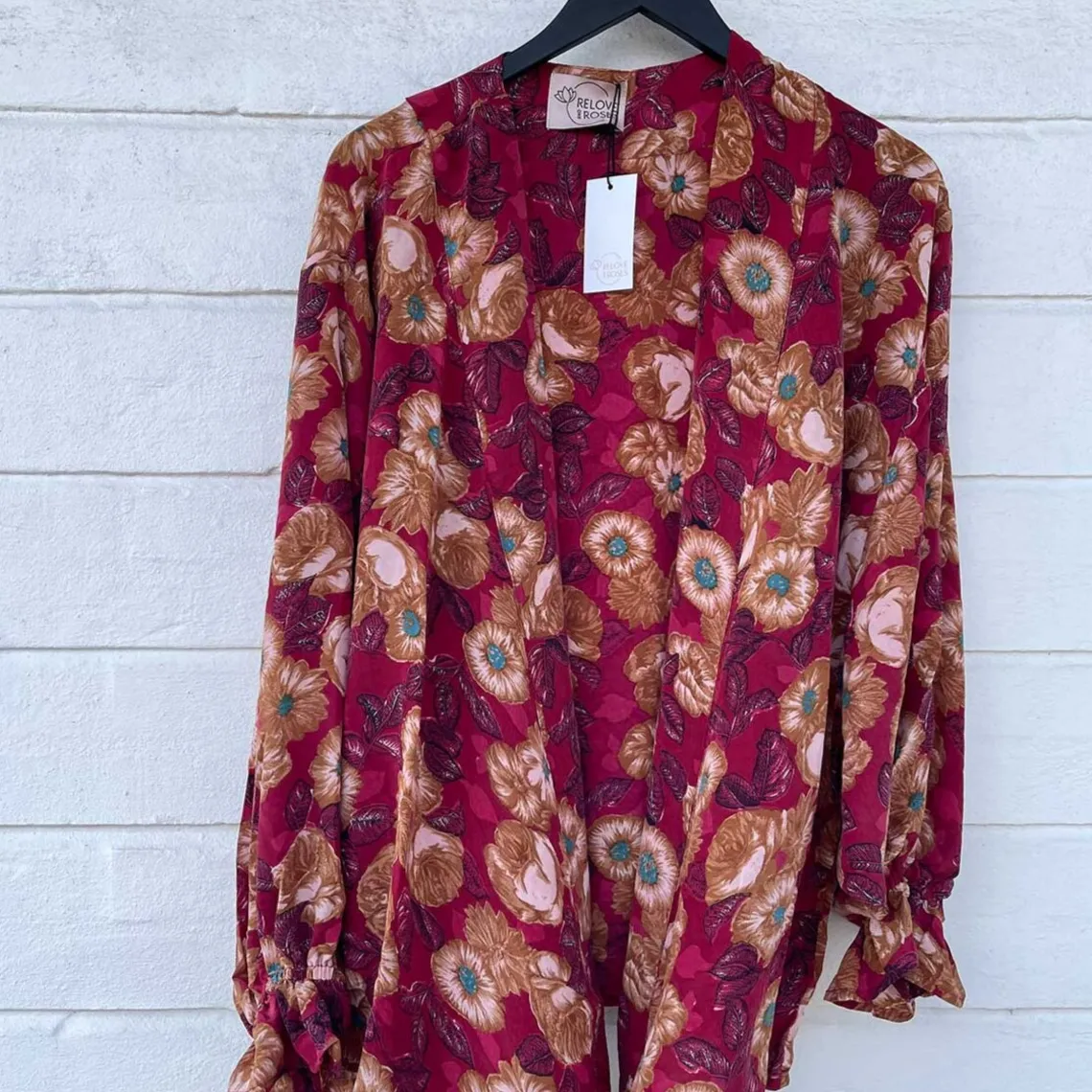 Da blusen er lavet af materiale med historie, kan der forekomme små pletter, løse tråde eller fint slid — betragt det som kærlige spor fra sariens tidligere liv.