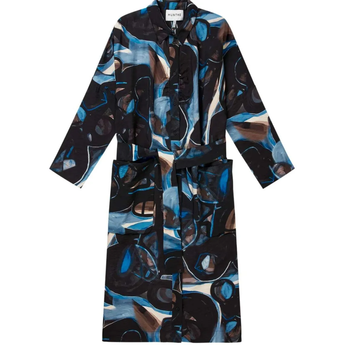 Lumica kjole fra Munthe. Her får du en mellemlang skjortekjole som kommer i det fineste print. Denne kjole er med en elegant knaplukning. Kjolen er designet med lange ærmer og kan styles med eller uden bælte.