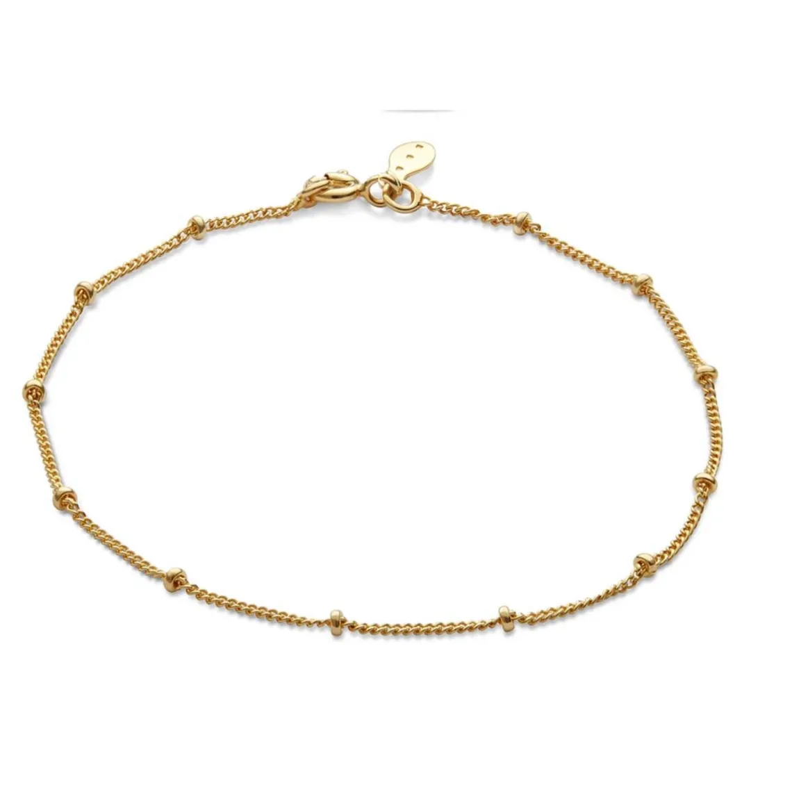 Nala armbåndet fra Maanesten ses her i 18 karat forgyldt sterling sølv. Armbåndet er enkel og elegant kæde, med små fine kugler fordelt hele vejen rundt. Armbåndets tidsløse udtryk gør det super cool i kombination med hvilke som helst smykker. Det er især fint sammen med andre enkle kæder i forgyldt sølv, eventuelt med lidt farvede perler eller vedhæng på. Maanestens smykker produceres hos dygtige guldsmede i Indien og prisen snyder derfor ikke med den høje kvalitet. Armbåndet kan justeres i forhold til håndleddet størrelse.