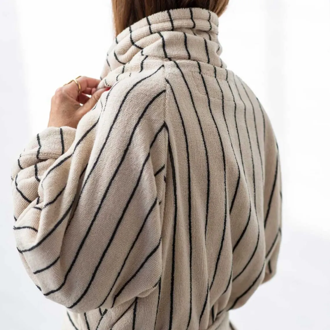 Naram Bathrobe er fremstillet af 100% økologisk bomuld og er OEKO-TEX® Made in Green-certificeret. Den er vævet med dobbelttråd, som sikrer høj absorberingsevne, lang holdbarhed og en luksuriøs blødhed. Forkæl dig selv med et blødt kram efter badet eller på langsomme morgener – kåbens klassiske design, sjalskrave, bæltelukning og to rummelige lommer kombinerer komfort og elegance. Hvis du er over 176 cm, eller ønsker et mere oversized fit, anbefaler vi størrelse L/XL. Materiale: 100% økologisk bomuld