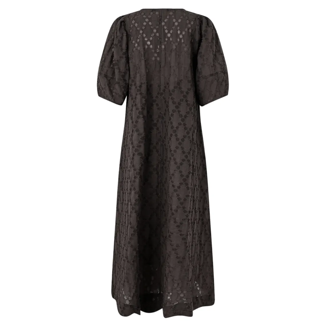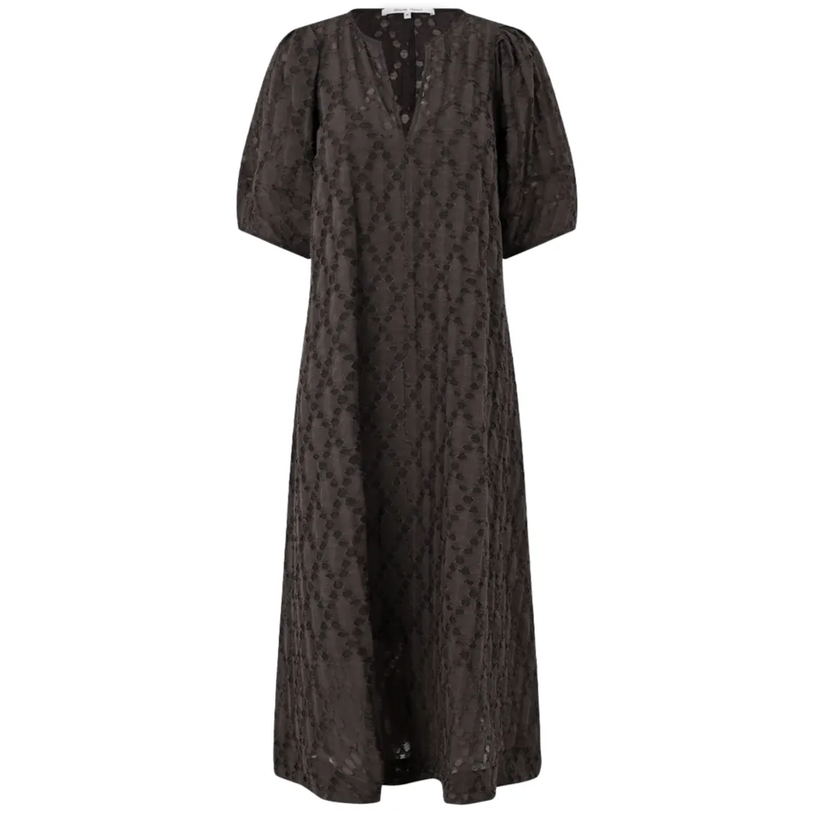 Second Female kortærmet kjole med burnout. Kjolen er fremstillet i en viskoseblanding med struktureret mønster med semitransparent burnout-effekt. Med V-udskæring og firkantede skuldersømme med korte pufærmer. Aftagelig underkjole med justerbare stropper.