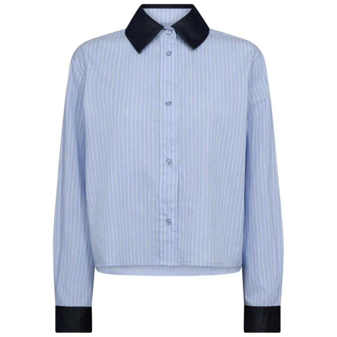 Nelson Stripe Shirt fra Co’Couture er en smart skjortebluse i en frisk pale blue farve. Blusen har lange ærmer, en klassisk spids krave og knaplukning langs fronten, som giver et stilrent og tidløst udtryk. Med en almindelig pasform er den let at style til både arbejde og fritid. Materiale: 100% bomuld
