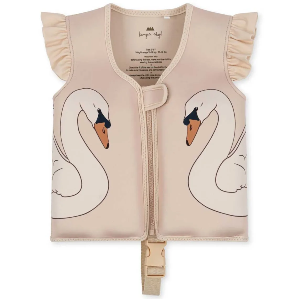 Designet med både lynlås- og velcrolukning. Med sikkerhedsstrop i skridtet, så barnet ikke kan glide ud af vesten. Materiale: 80% neopren, 20% polyesterfor