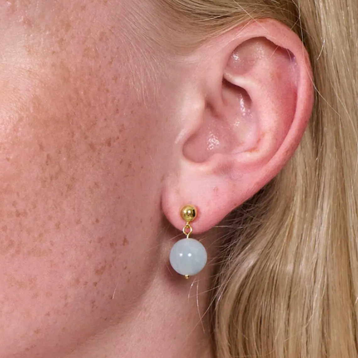 Nora Aquamarine Earrings er skabt med intentionen om at styrke mod, give beskyttelse og bringe mere glæde ind i hverdagen. Aquamarin forbindes med beroligende egenskaber, der kan hjælpe med at lindre stress og skabe indre ro. De klare blå nuancer symboliserer klarhed og balance, og øreringene er udført med stor omhu og finesse – et smykke, der udstråler positiv energi og harmoni. Materiale: 18 karat forgyldt sterlingsølv (925)