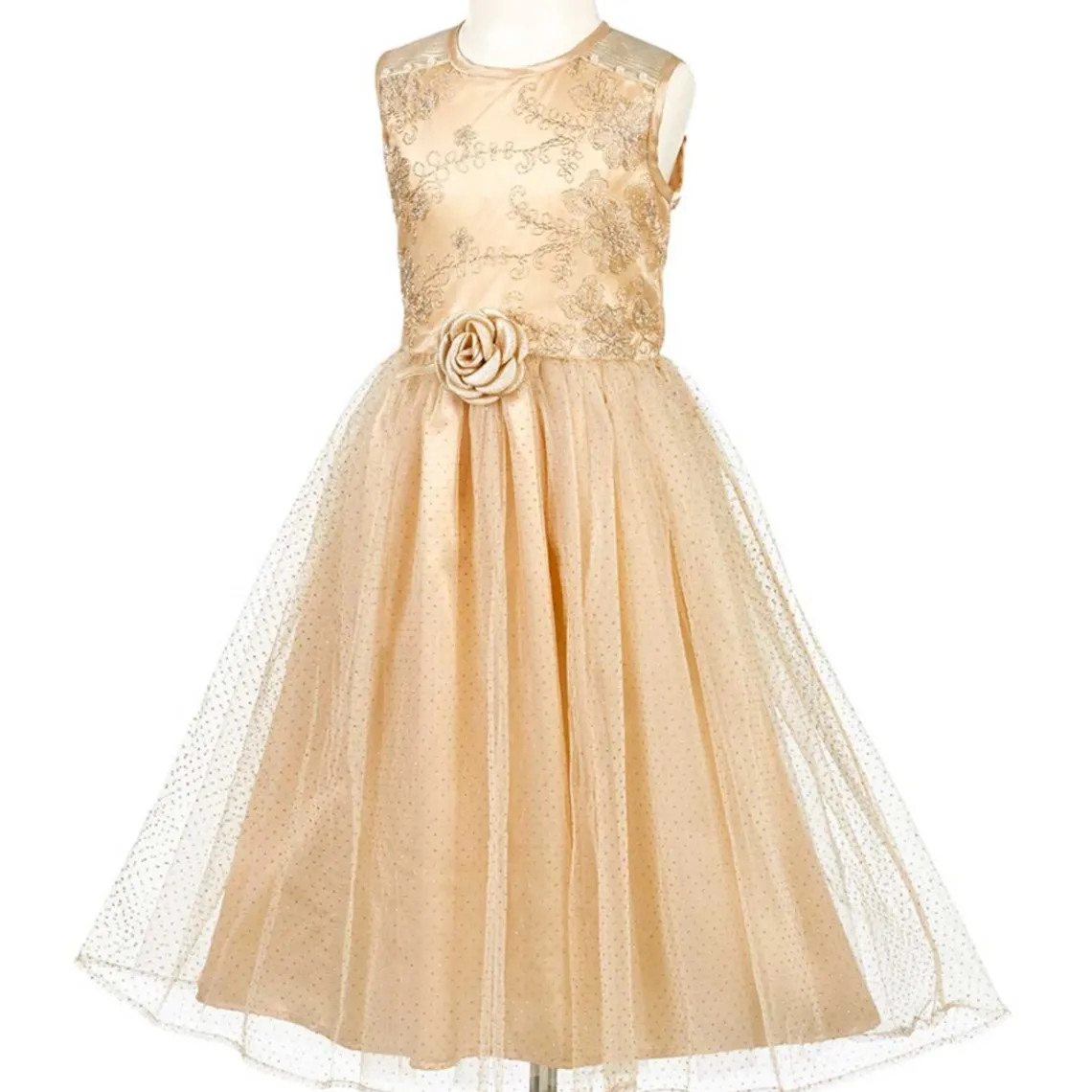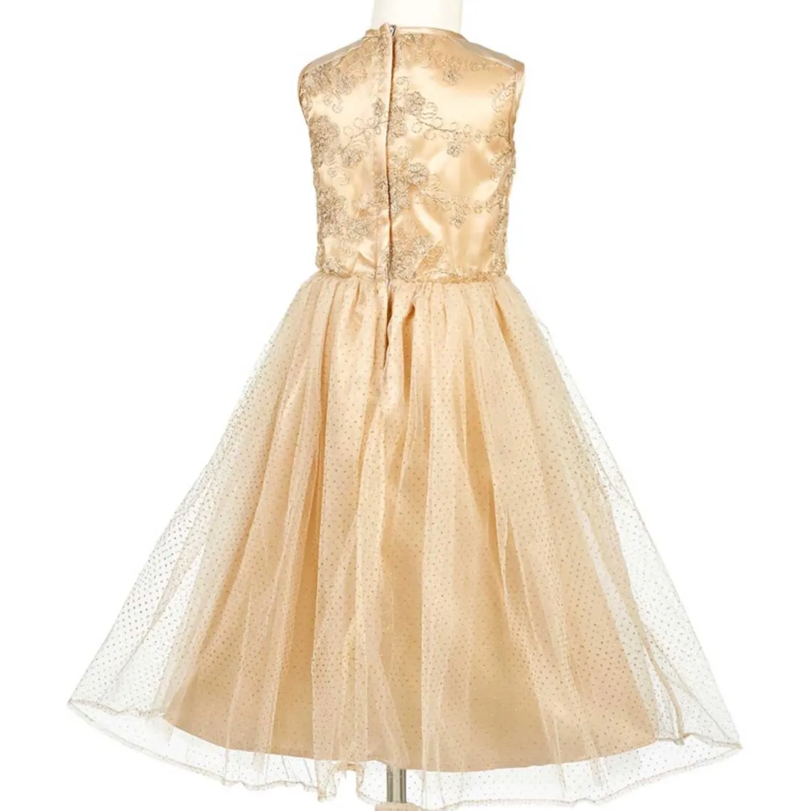 Noraline prinsessekjole fra Souza. Denne skønne Souza prinsessekjole har brede skulderstropper med guldglimmer og perler. Kjolen har en rund halsudskæring, og overdelen er guldfarvet med yndige blomster lavet af guldtråd. I taljen er der en rose i guldglimmer og en smal elastikkant, som giver skørtet en god vidde. Skørtet består af tre lag, hvoraf det yderste lag består af guldfarvet tyl med et allover print af guldglimmer prikker. Det midterste lag består af guldfarvet tyl, mens det inderste lag består af guldfarvet satin. Denne prinsessekjole åbnes med en lynlås i ryggen.
