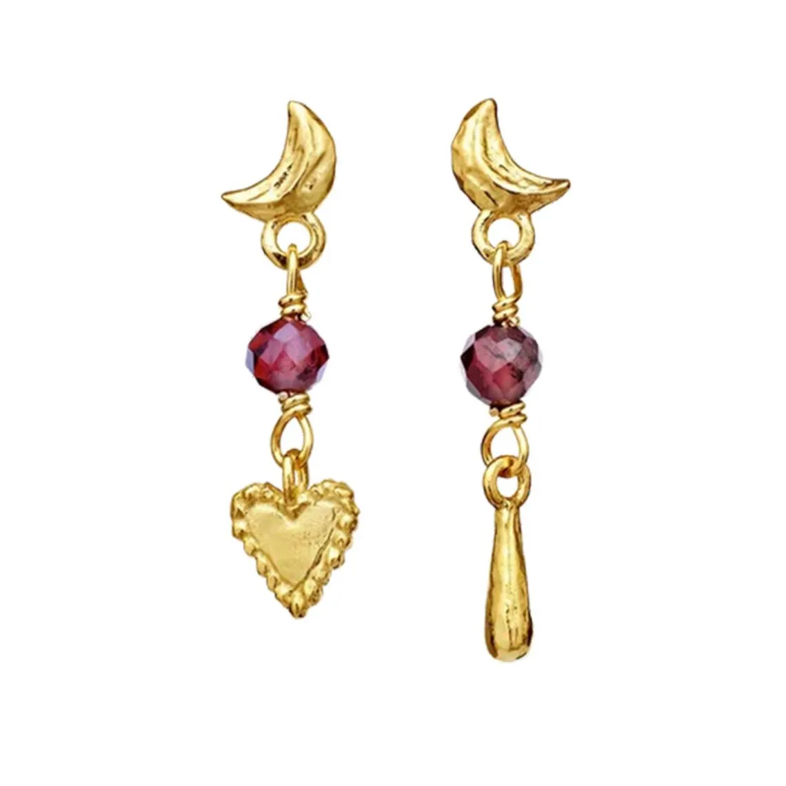 Nuova øreringene fra Maanesten hylder nye begyndelser og kærlighedens mange former. De gyldne halvmåner prydes af fine tråde med pink granater, hjerter og tårer – symboler på den kærlighed, vi alle er omgivet af. Et feminint og poetisk smykke, der tilføjer varme og sjæl til ethvert look. Materiale: Genanvendt sterlingsølv (925) belagt med 18 karat guld, pink granat