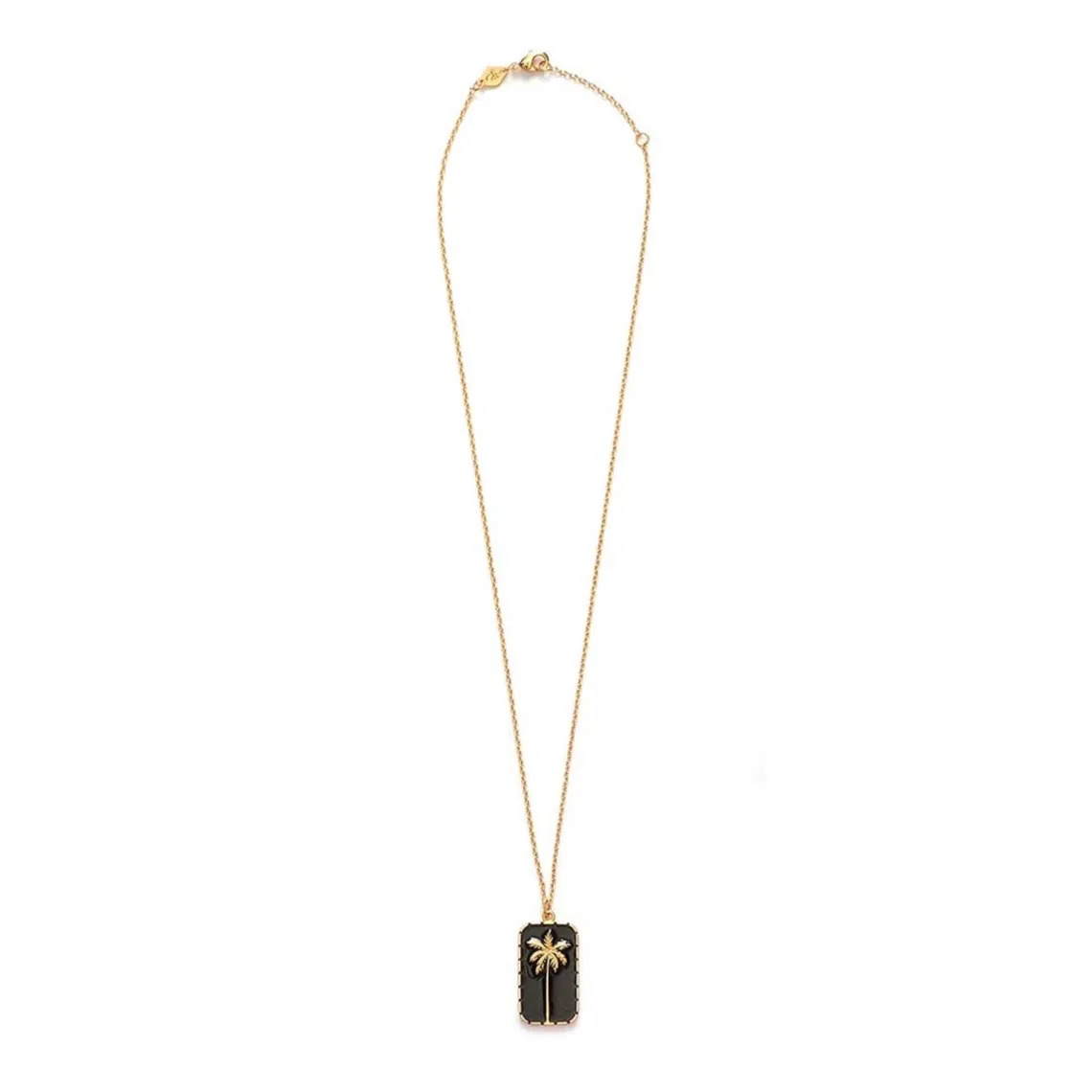 Palm Springs halskæden fra ANNI LU er en fin hyldest til solnedgangen over Palm Springs. Med den gyldne palme over den sorte emalje, får halskæden et lidt mere råt og cool look, til et ellers fint og forgyldt ANNI LU smykke. Med det sorte og det forgyldte i kombination, fungerer halskæden rigtig godt til langt de fleste farver og overdele. Halskæden er både fin for sig selv, men kunne også fungere fint med en kortere guldkæde ved siden af. Halskæden måler 45 cm, og er af 18kt forgyldt messing. Vedhænget måler 25 mm.