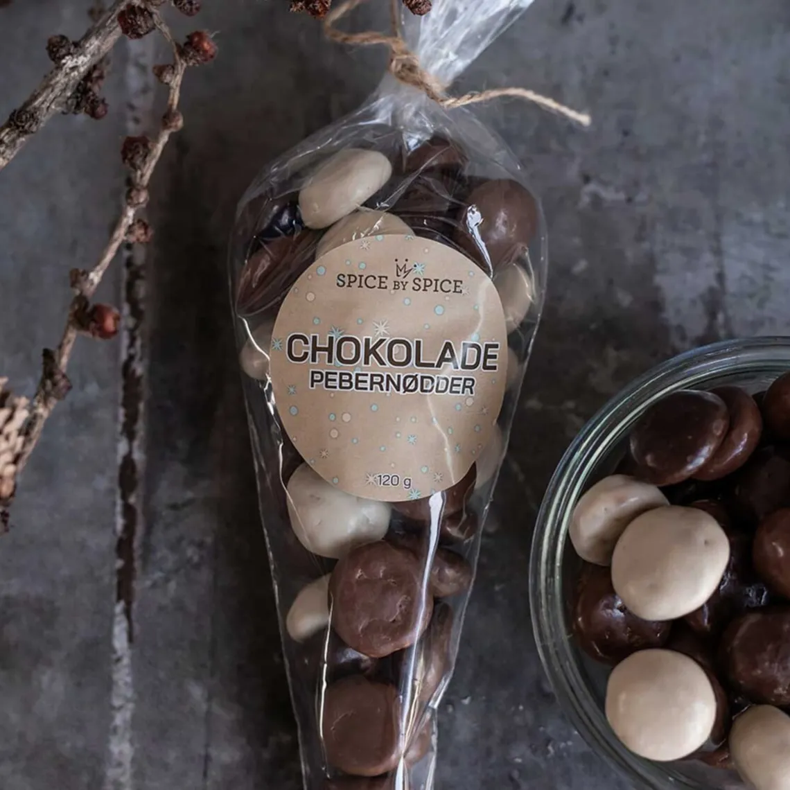 Pebernødder – Chokolademix fra Spice by Spice. Her får du nogle lækre pebernødder med mørk, mælke og hvid chokoladeovertræk.