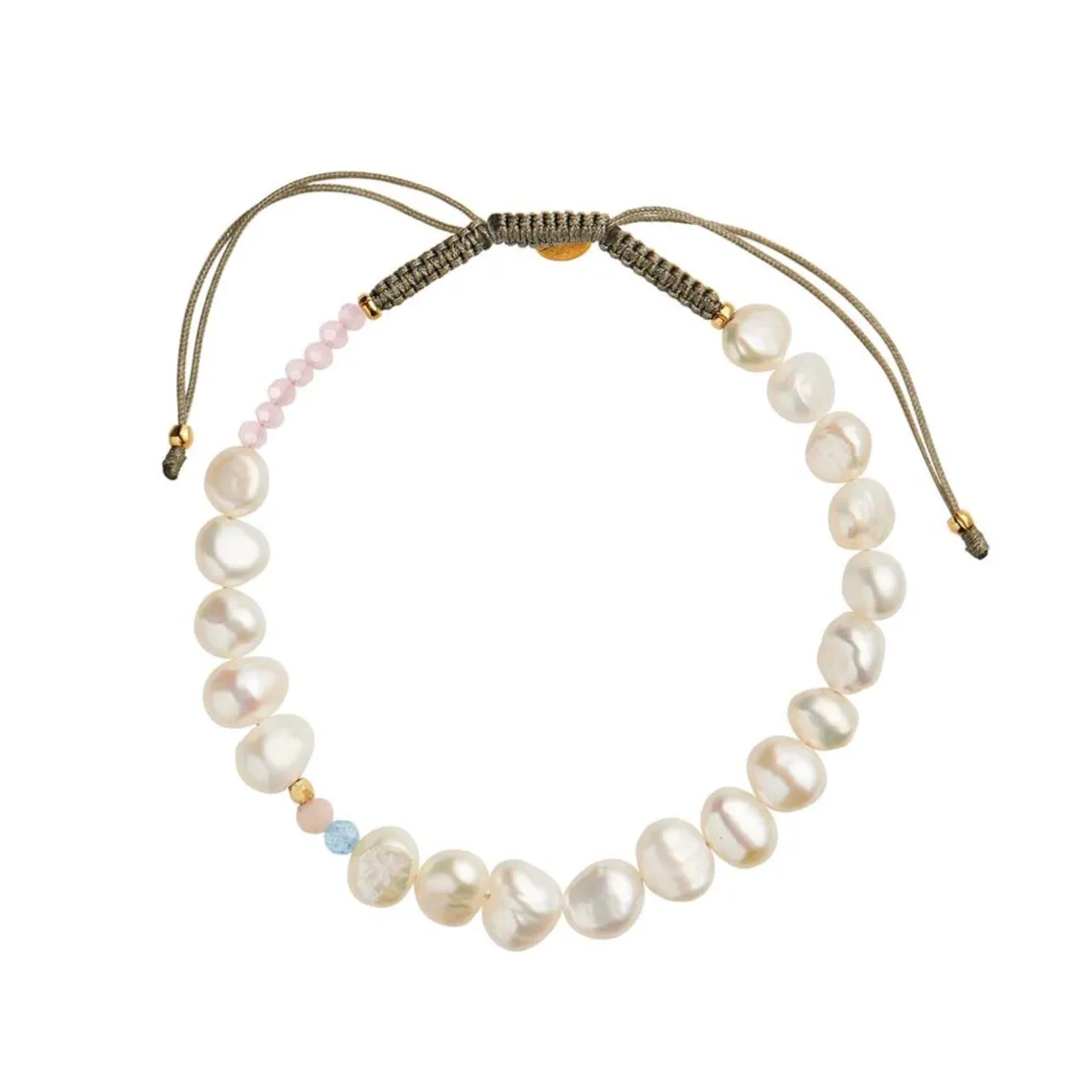 Fint armbånd perskvandsperler drysset med fine detaljer i blå og lyserøde ædelsten. Armbåndet er lavet i håndknyttet nylon, der gør det nemt at tage af og på. Vær venligst opmærksom på, at ferskvandperlerne kan variere i form, størrelse og udtryk, hvilket gør hvert enkelt armbånd unikt. Materialer: 18 karat forgyldt 925 sterlingsølv, ferskvandsperler, pink opal, glasperler, blå agat