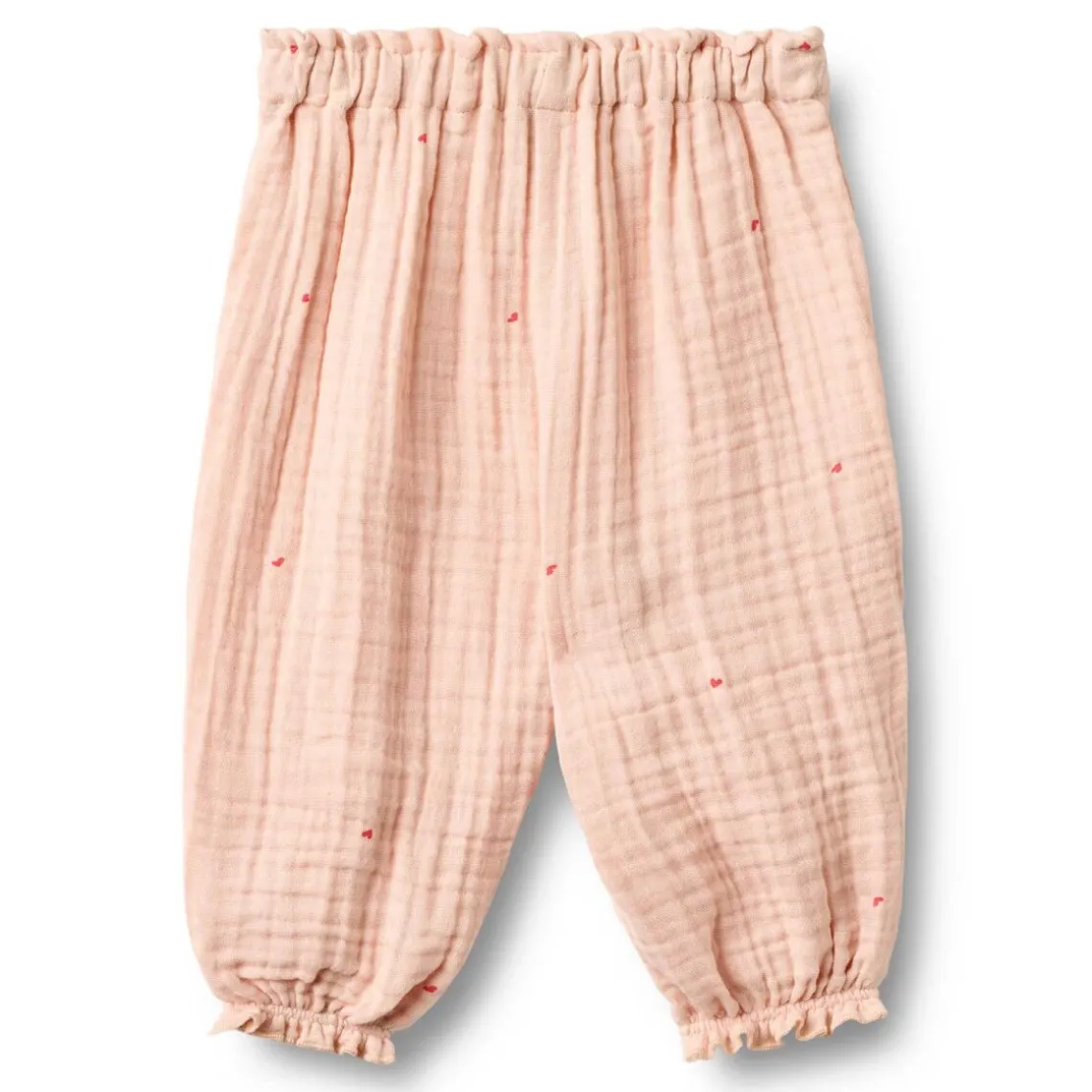 Bløde bukser til babyer i økologisk bomuldsgaze med løs puffy pasform. Bukserne har justerbar elastik i taljen, elastik ved benkanterne og masser af folder, som skaber et rynket og charmerende udtryk. Stoffet har et let trykt krøllet mønster, der giver et raffineret look. De lette bukser er perfekte til sommergarderoben og kombinerer komfort, åndbarhed og elegant design – velegnet til både hverdag og særlige lejligheder. Materiale: 100% økologisk bomuld