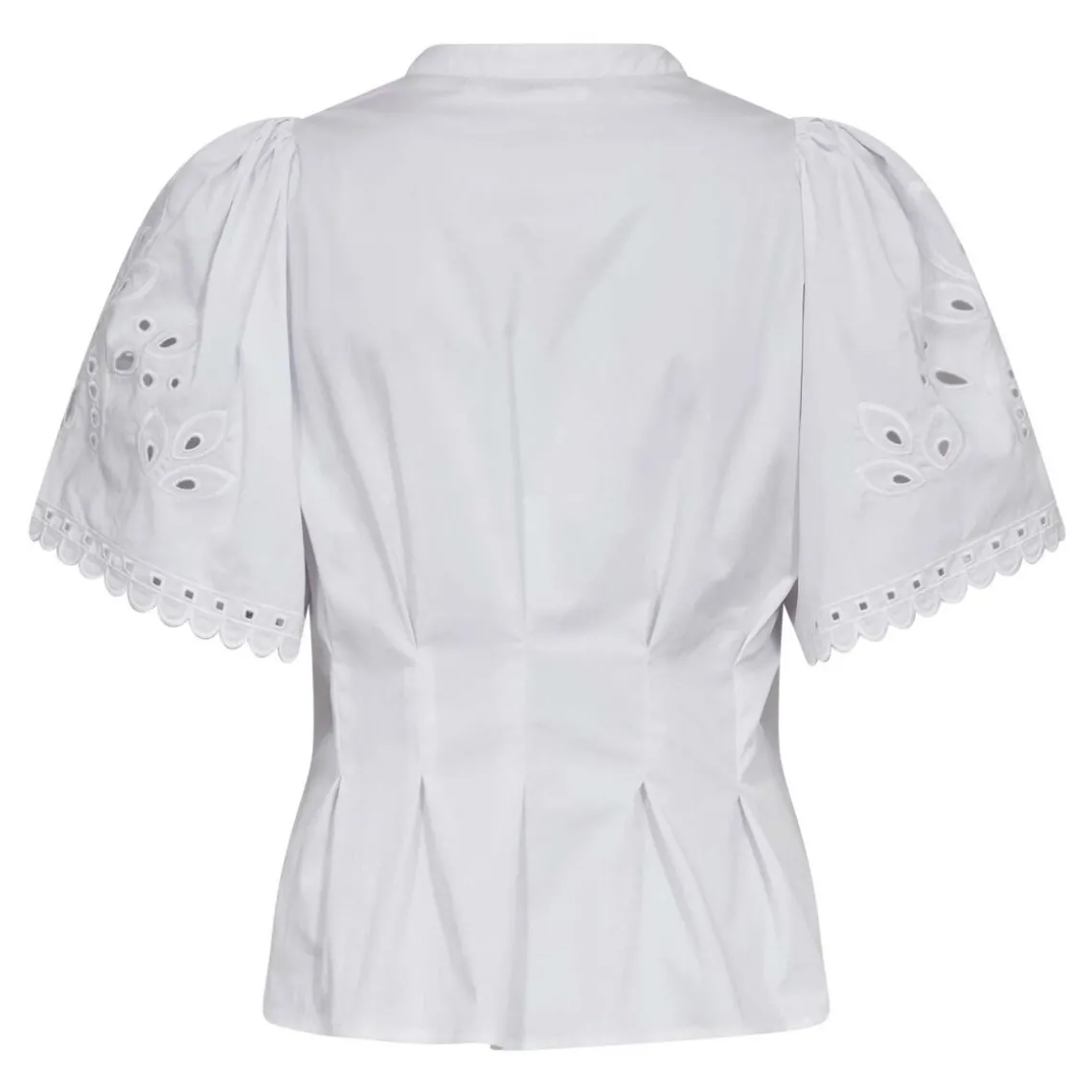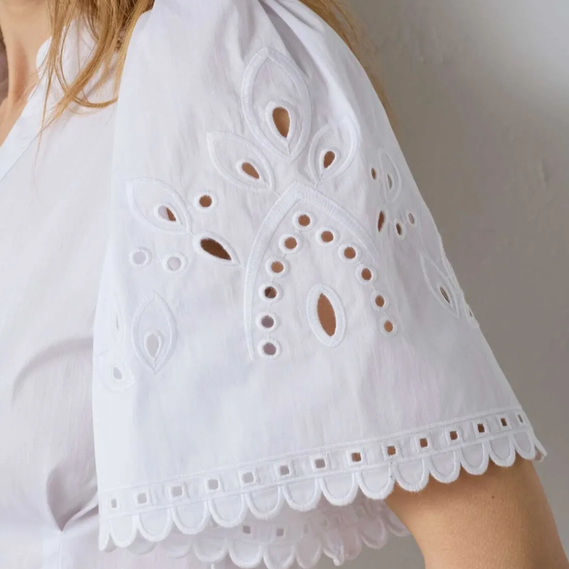 Denne hvide V‑shirt fra Co Couture kombinerer det klassiske t‑shirt‑look med feminine broderidetaljer og en flatterende V‑udskæring. Den har et enkelt, tidløst design, som gør den nem at style både til hverdagens casual outfits og til mere polerede looks. Broderiet tilføjer et subtilt og håndlavet udtryk, som løfter t‑shirten ud over det helt basale.