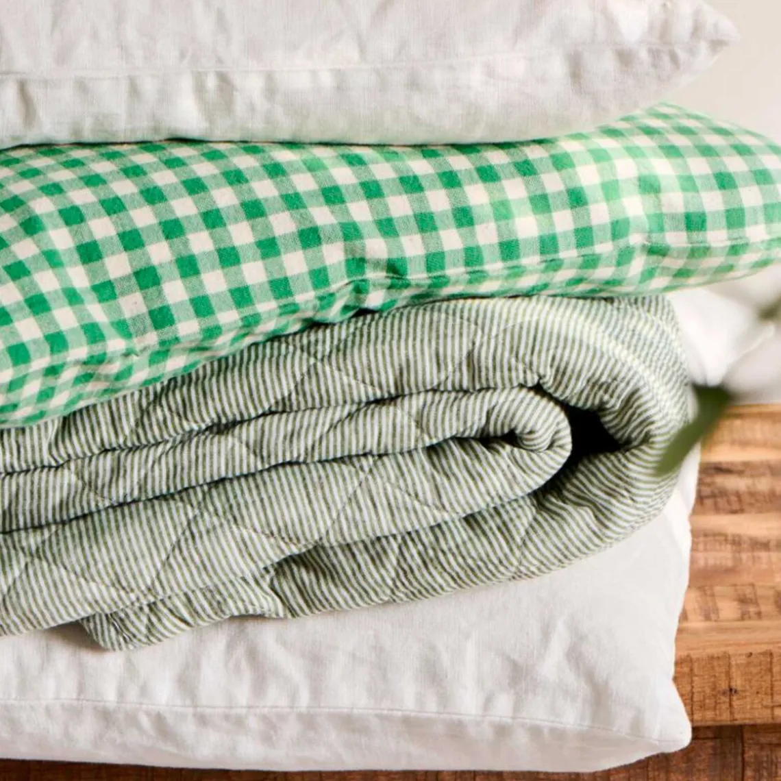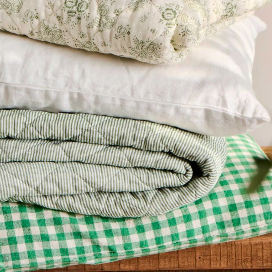 Lækkert, vatteret tæppe i blød bomuldskvalitet med klassiske mælkedrengestriber i hvid og støvgrøn. Tæppet har et tidløst udtryk, der passer smukt ind i både moderne og mere klassiske hjem, og den lette vattering gør det ideelt som ekstra lag på sofaen, i lænestolen eller på sengen.