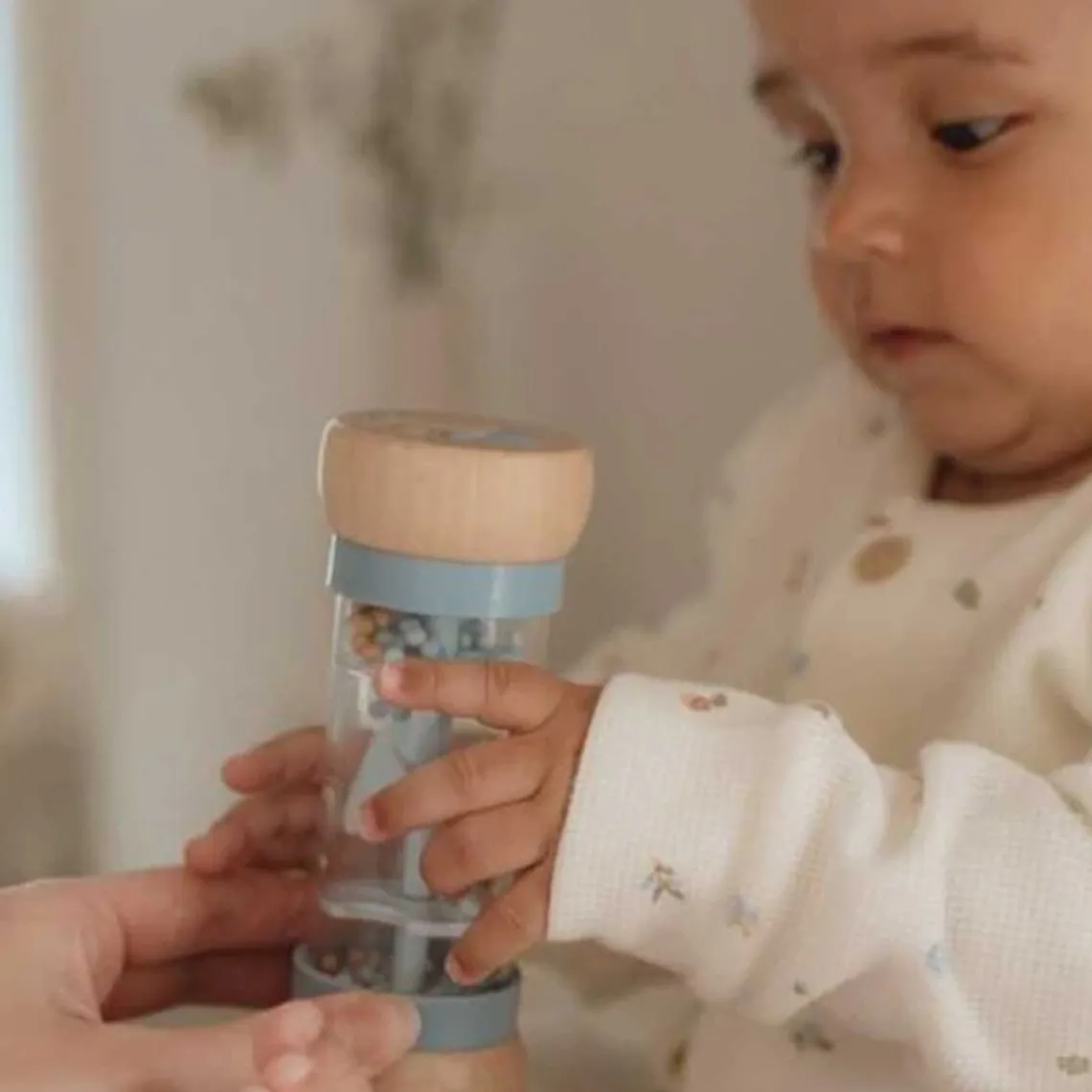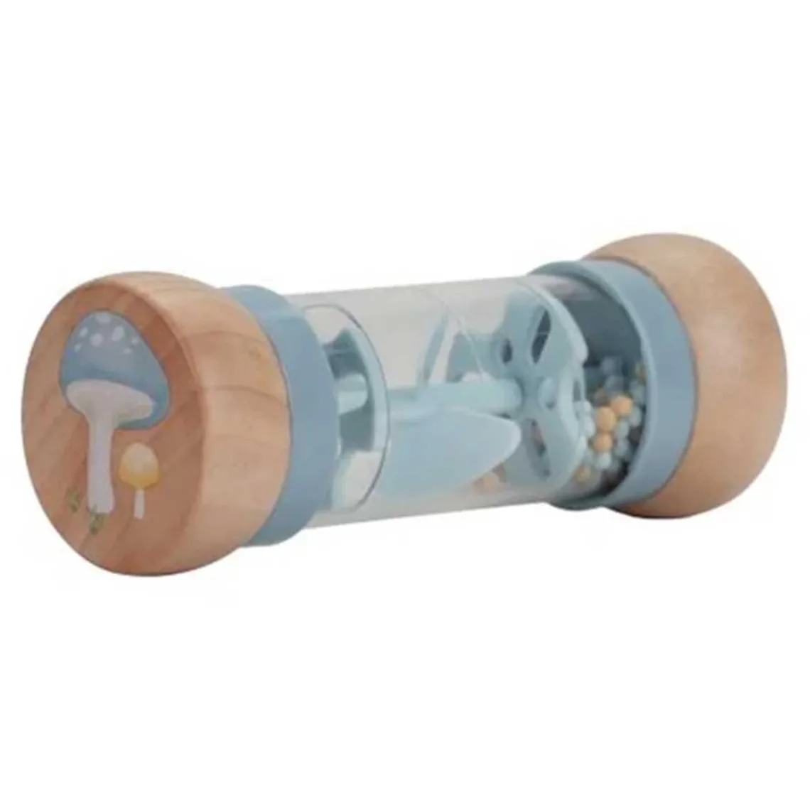 Ryst og rasle! Vend regnmageren om og lyt til den beroligende lyd af kuglerne, der bevæger sig fra side til side. Regnmagerne stimulerer babyens sensoriske udvikling og musikalske talent. Kuglerne falder gennem små åbninger i røret og får propellen til at rotere, hvilket resulterer i en behagelig lyd. Regnmageren er designet til små hænder og er behagelig at holde om. Toppen og bunden af træ er dekoreret med en illustrationer fra Forest Friends-kollektionen.