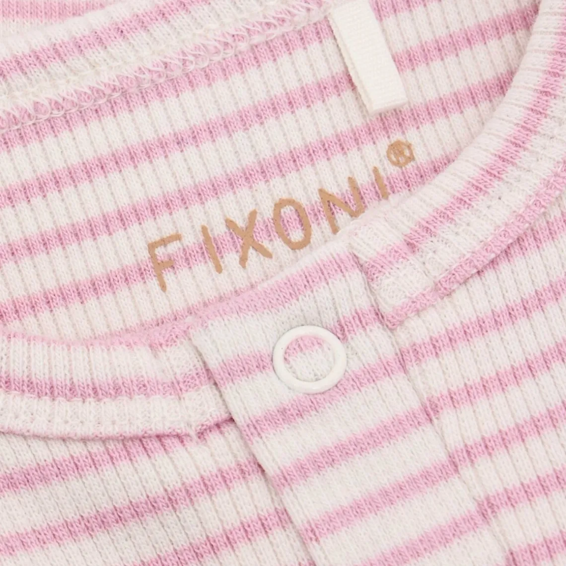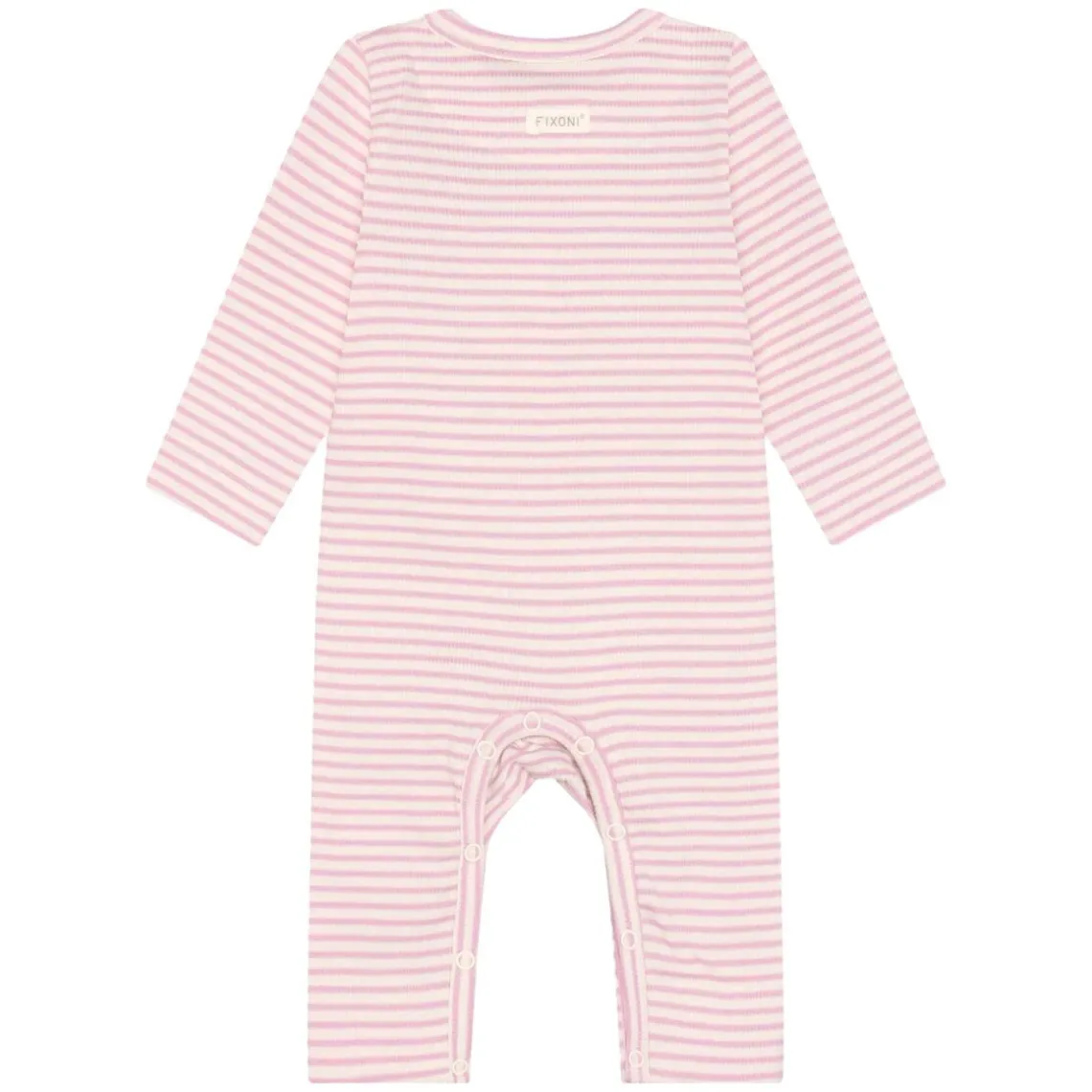 Stribet heldragt fra FIXONI i blød og strækbar kvalitet. Dragten kan åbnes foran og mellem benene, hvilket gør den nem at tage af og på og giver høj komfort hele dagen. Materiale: 95% bomuld, 5% elastan