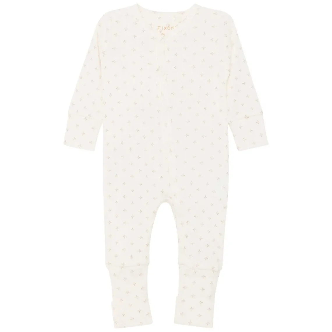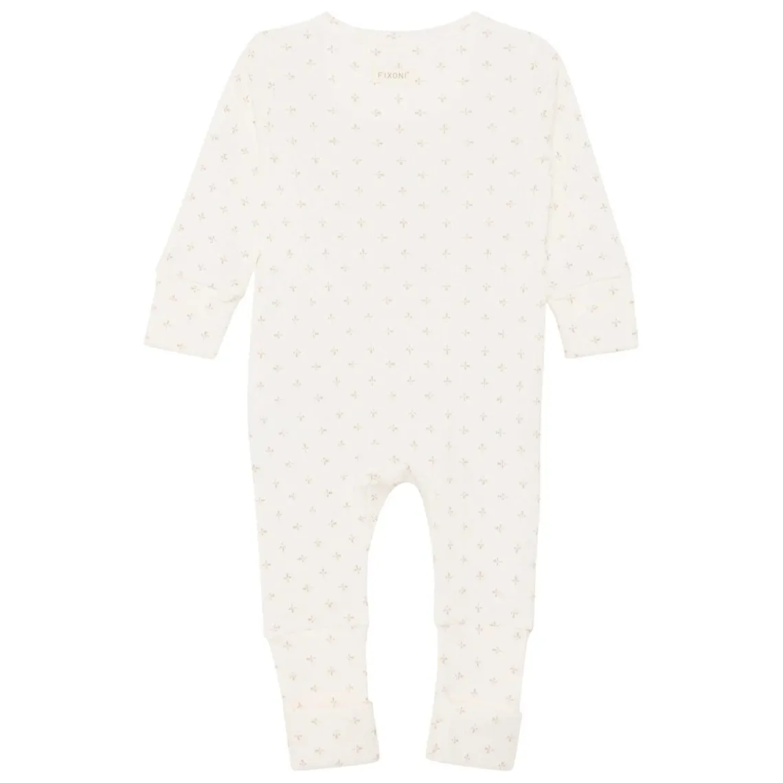 Fin heldragt fra FIXONI med delikat allover-print i blød ribkvalitet. Ærmer og ben kan foldes op, så længden nemt kan justeres efter barnets behov. Heldragten lukkes med trykknapper langs fronten, hvilket gør den nem og praktisk at tage af og på. Materiale: 100% bomuld