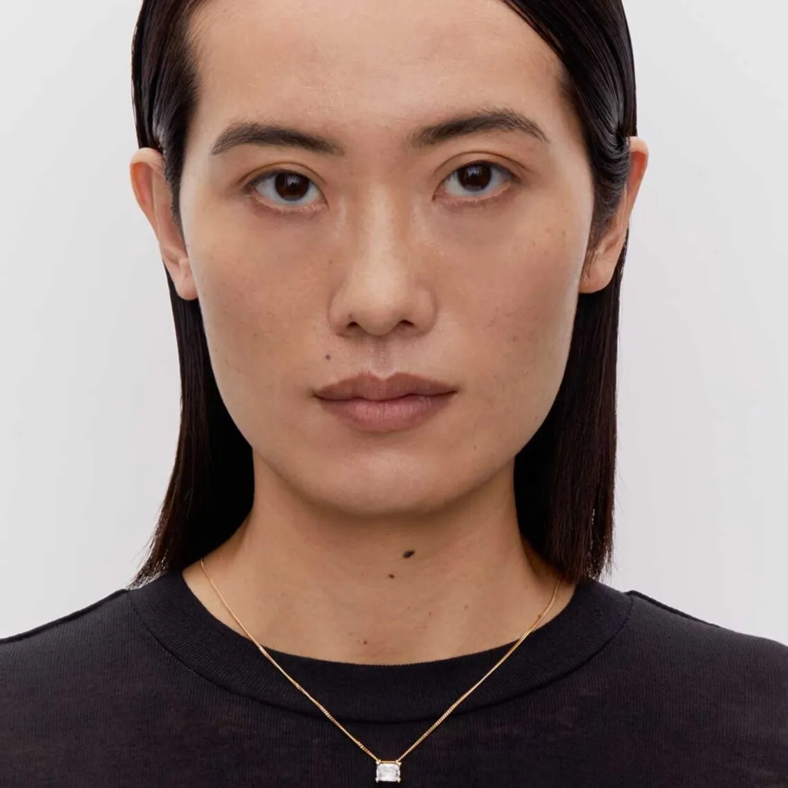 Roppongi drop halskæde fra Maria Black. Denne halskæde er inspireret af Tokyos gader. Her får du en tynd halskæde med en justerbar skyder til at skabe enhver længde. Den store hvide ottekantede, triformede zirkonia-sten vedhæng, glider på kæden.