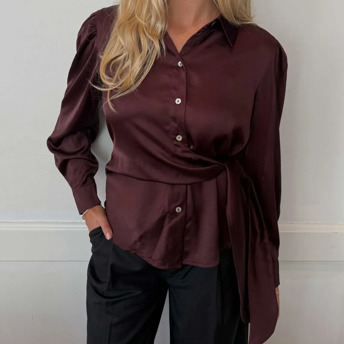 Continue Copenhagen Roseanne Solid Blouse i bordeaux er en elegant skjorte med satinfinish, der giver et sofistikeret og moderne udtryk. Den klassiske krave, knaplukning og den smarte slå om detalje med bindebånd i taljen gør den til et alsidig og stilfuld valg. Perfekt til både hverdagsbrug og festlige lejligheder.