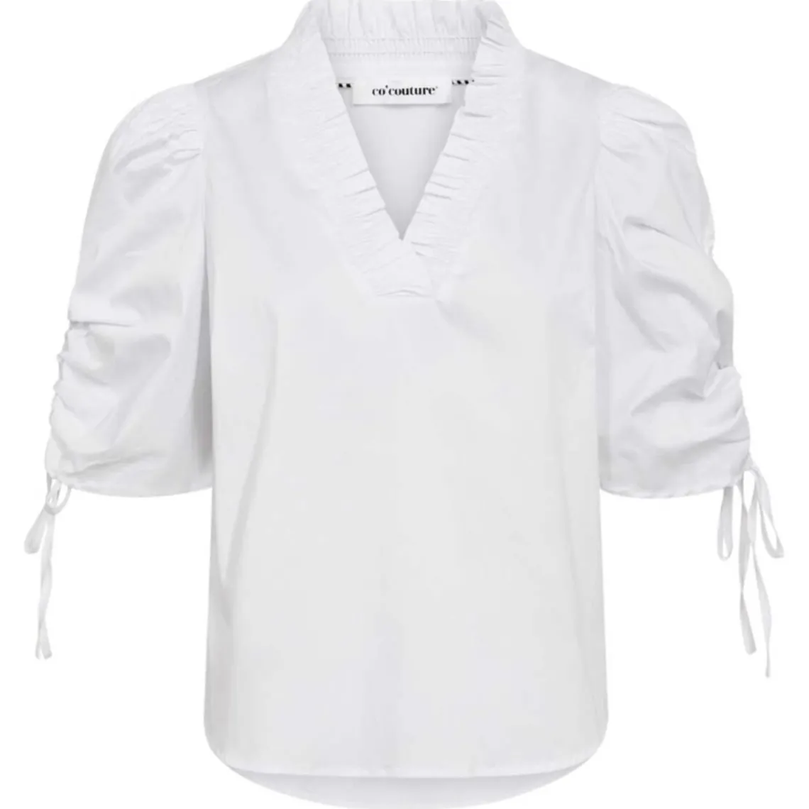 Feminin bluse fra Co’Couture med korte ærmer og en flatterende V-udskæring, der giver et let og elegant look. De fine bindebåndsdetaljer på ærmerne tilfører et unikt og delikat touch, som løfter blusen til en stilfuld favorit i garderoben. En perfekt bluse til både hverdag og særlige lejligheder. Materiale: 70% bomuld, 27% polyamid, 3% elasthan