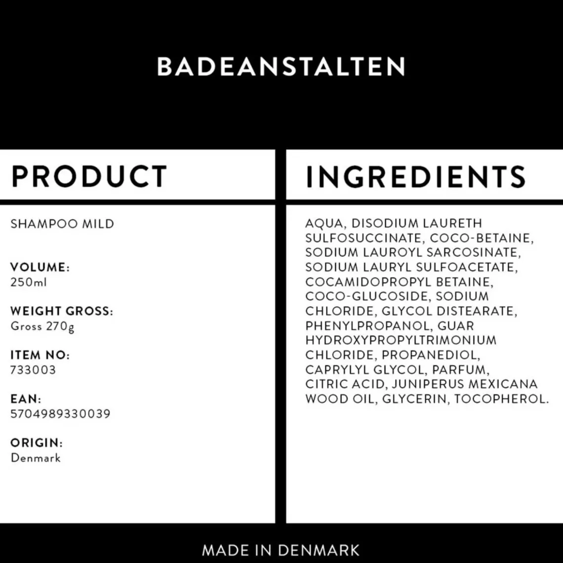 Mild shampoo er en shampoo, der virkelig lever op til sit navn. Den skånsomme formel er fri for SLS og SLES, som kan være hårde mod hår og hovedbund. Vores shampoo er fremstillet med omhu, så den renser dit hår og din hovedbund på en effektiv måde, men stadig bevare den naturlige balance i dit hår. Det betyder, at du kan bruge Mild shampoo hver dag, uden at bekymre dig om at udtørre eller beskadige dit hår.