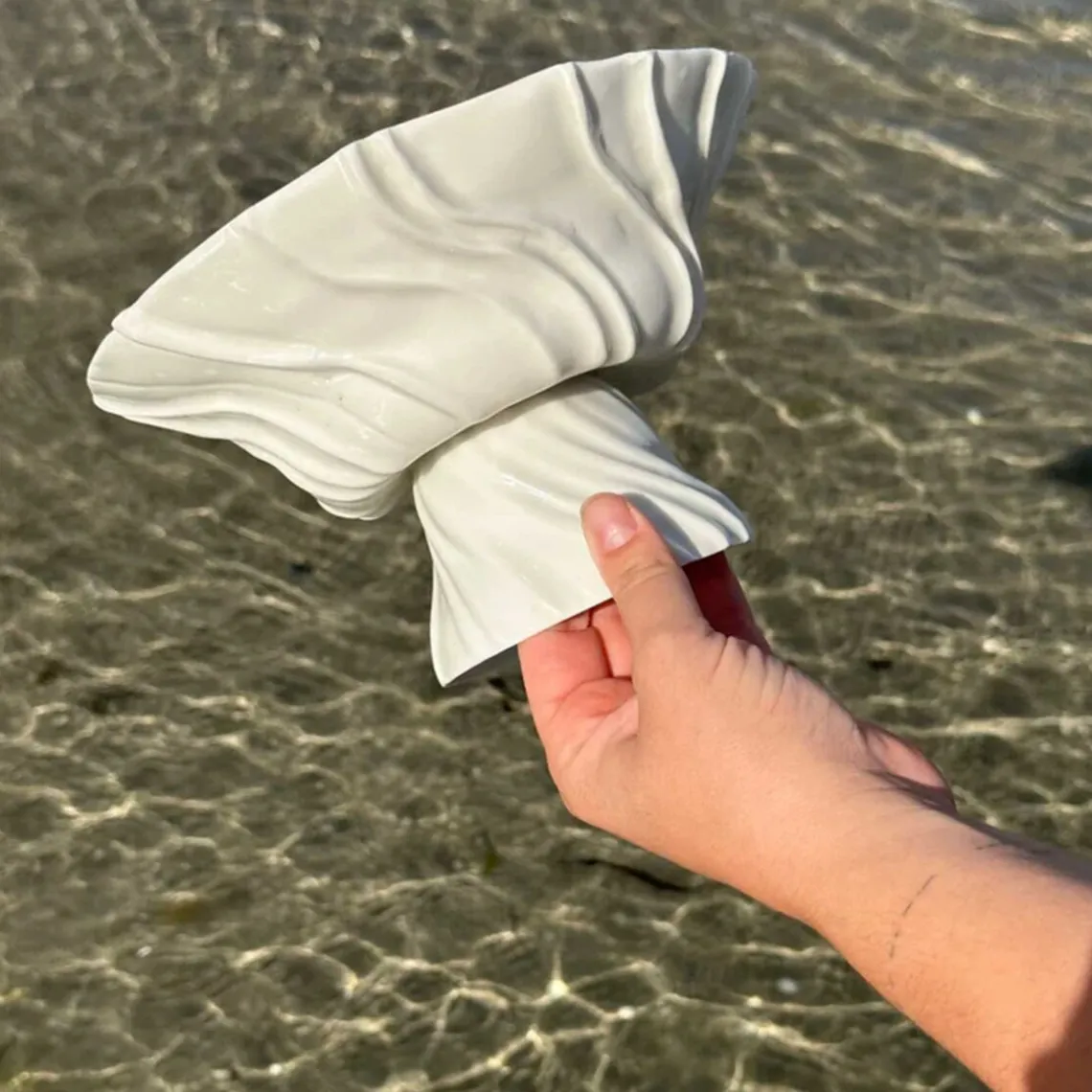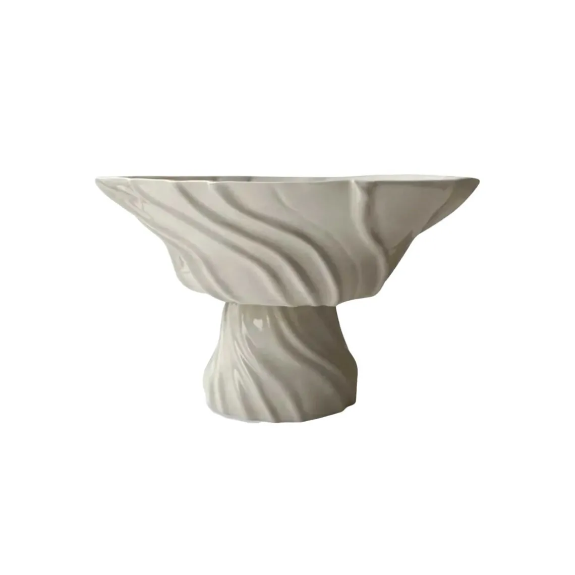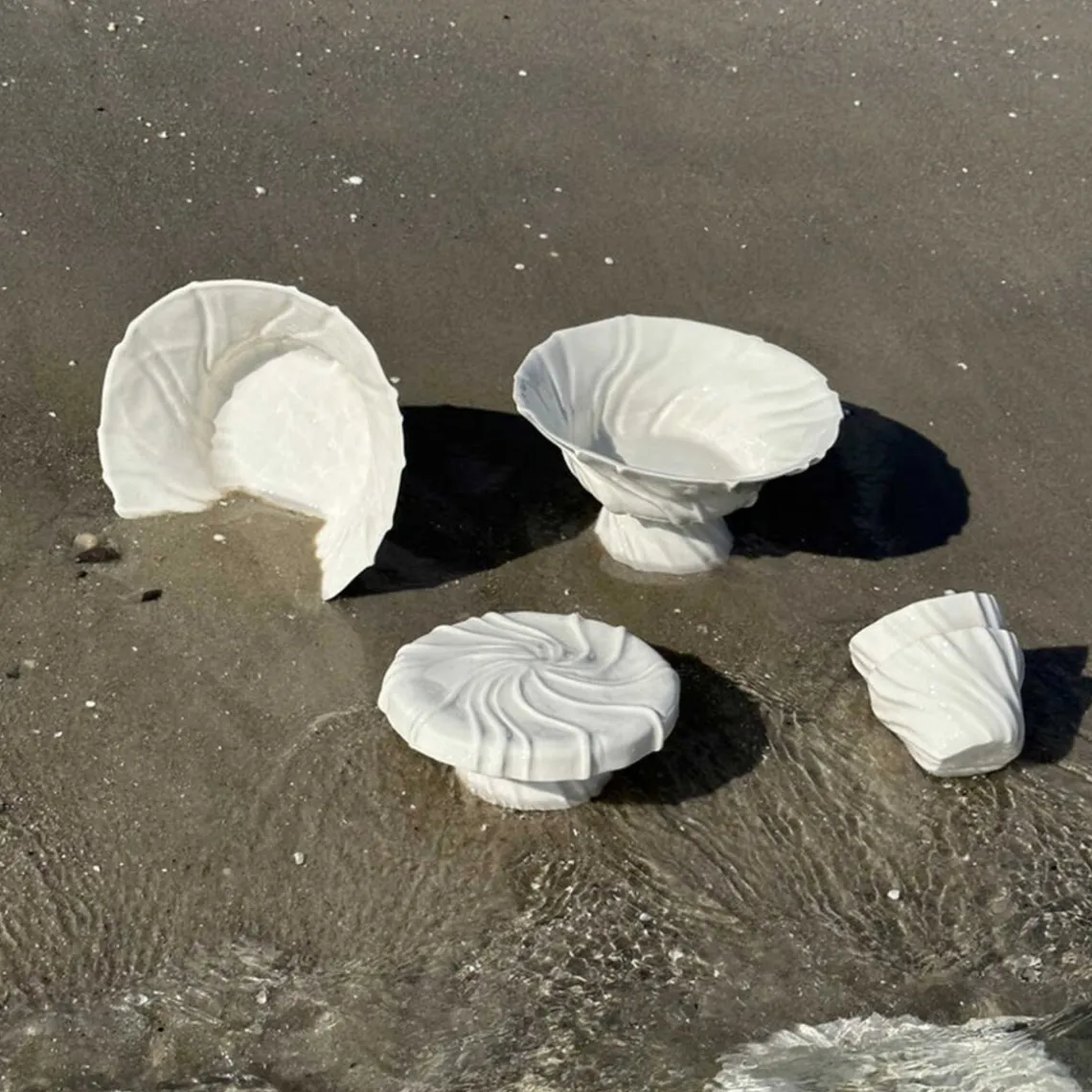 Overfladen er inspireret af den bølgede sandbund, når vandet trækker sig tilbage og blotter den nøgne havbund – det helt særlige ved dette foranderlige område. Opsatsen er håndlavet, og der kan forekomme små variationer fra opsats til opsats, hvilket gør hver enkelt unik. Materiale: porcelæn