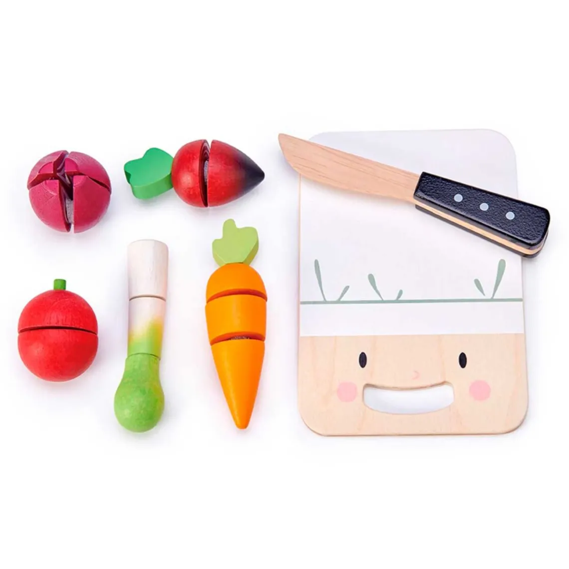 Indhold: Skærebræt, trækniv, løg, gulerod, porre, rødbede og tomat. Materiale: Træ