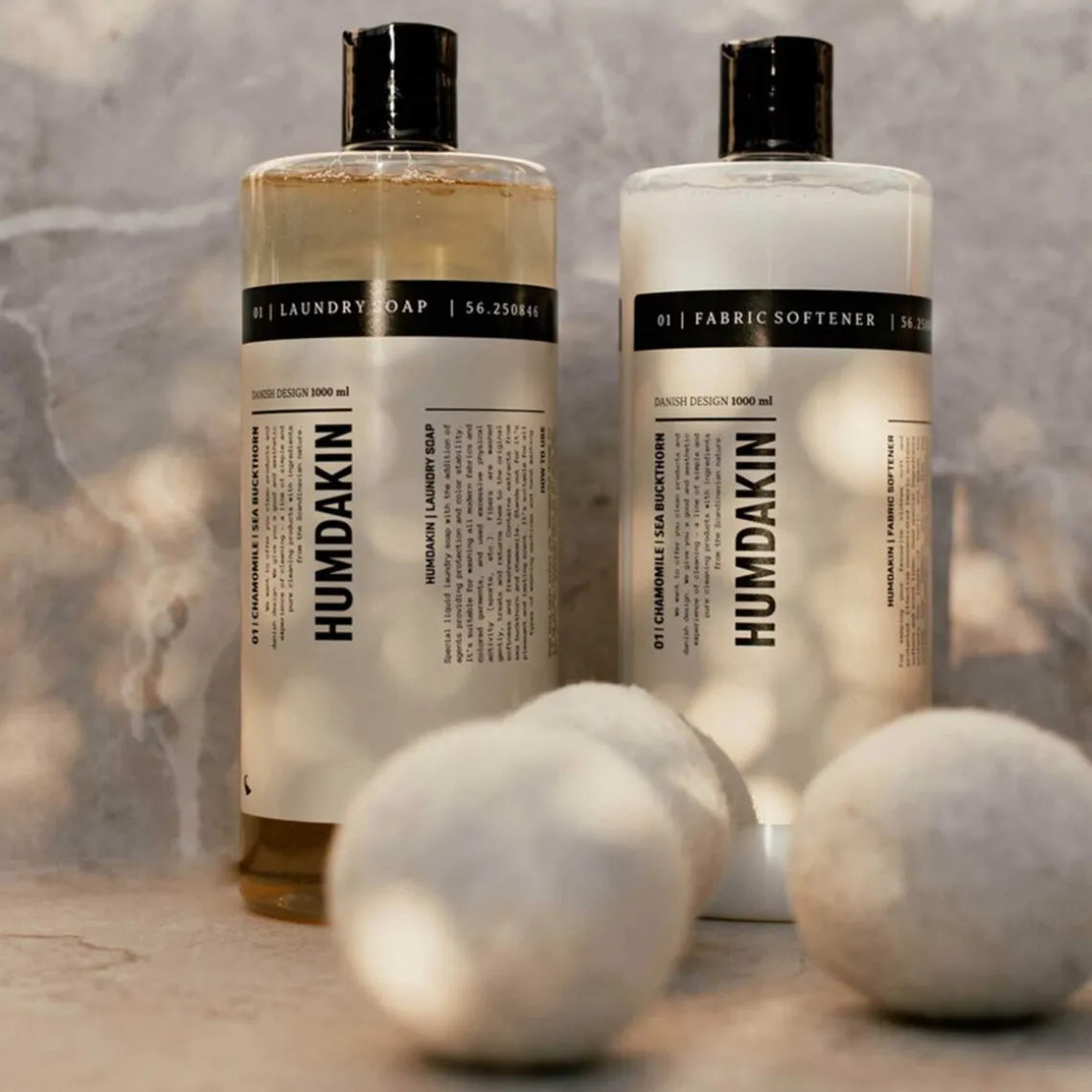 Humdakin Skyllemiddel – Kamille & Havtorn, 1000 ml Mildt skyllemiddel, der efterlader tøjet blødt, let at stryge og velduftende. Beriget med naturlige ekstrakter af kamille og havtorn, som er sensitive og allergivenlige. Beskytter fibrene og bevarer tøjets blødhed vask efter vask. pH 3,0–3,5, dermatologisk testet og fri for parabener, farvestoffer og skadelige kemikalier.