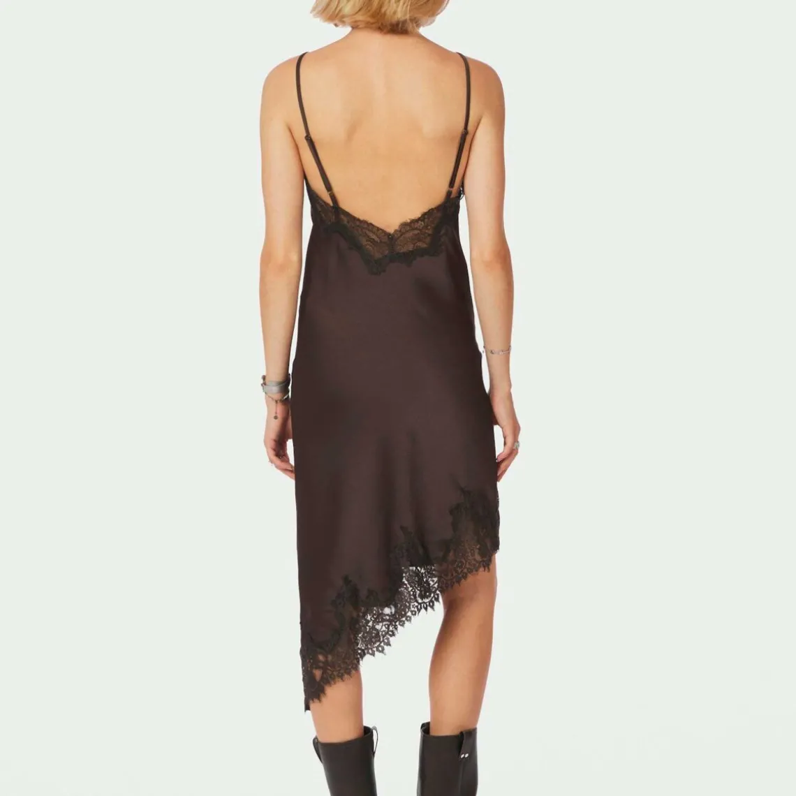 Elegant og feminin kjole med smukke blonde-detaljer og asymmetrisk pasform, der giver et let og sofistikeret udtryk. Kjolen er fremstillet i en lækker satin-kvalitet, der falder flot og giver et luksuriøst look – perfekt til festlige lejligheder eller særlige aftener. Materiale: 97% polyester, 3% elastane