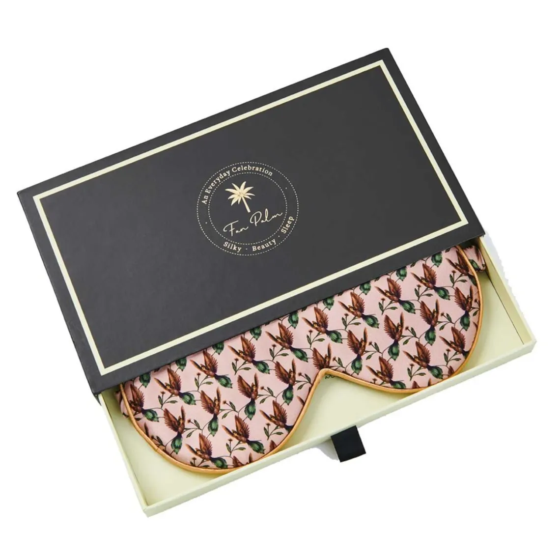Skøn sovemaske i 100% mulberrysilke iden flotteste æske. Nyd en fredfyldt nattesøvn med Fan Palmsbløde og behagelige sovemaske, som sidder godt på ansigtet og holder lyset ude.De silkebelagte elastikker sikrer maksimal komfort uden at skade håret.