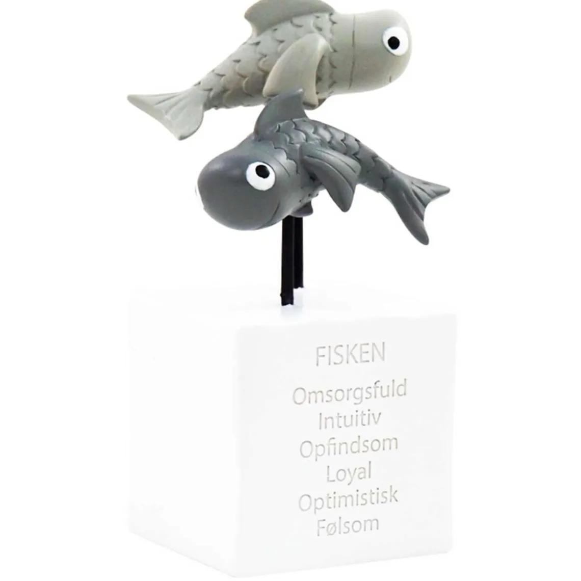 Sparebøssen ligger i den hvide kube som har en charmerende figur på toppen. Denne figur symboliserer Fisk i stjernetegn. På forsiden kan du læse 6 søde egenskaber om stjernetegnet, mens bagsiden har indgravering stjernetegnets zodiac-symbol samt en horisontal pengesprække. I bunden findes det praktiske drejelåg, der gør det nemt at tømme bøssen for mønter.