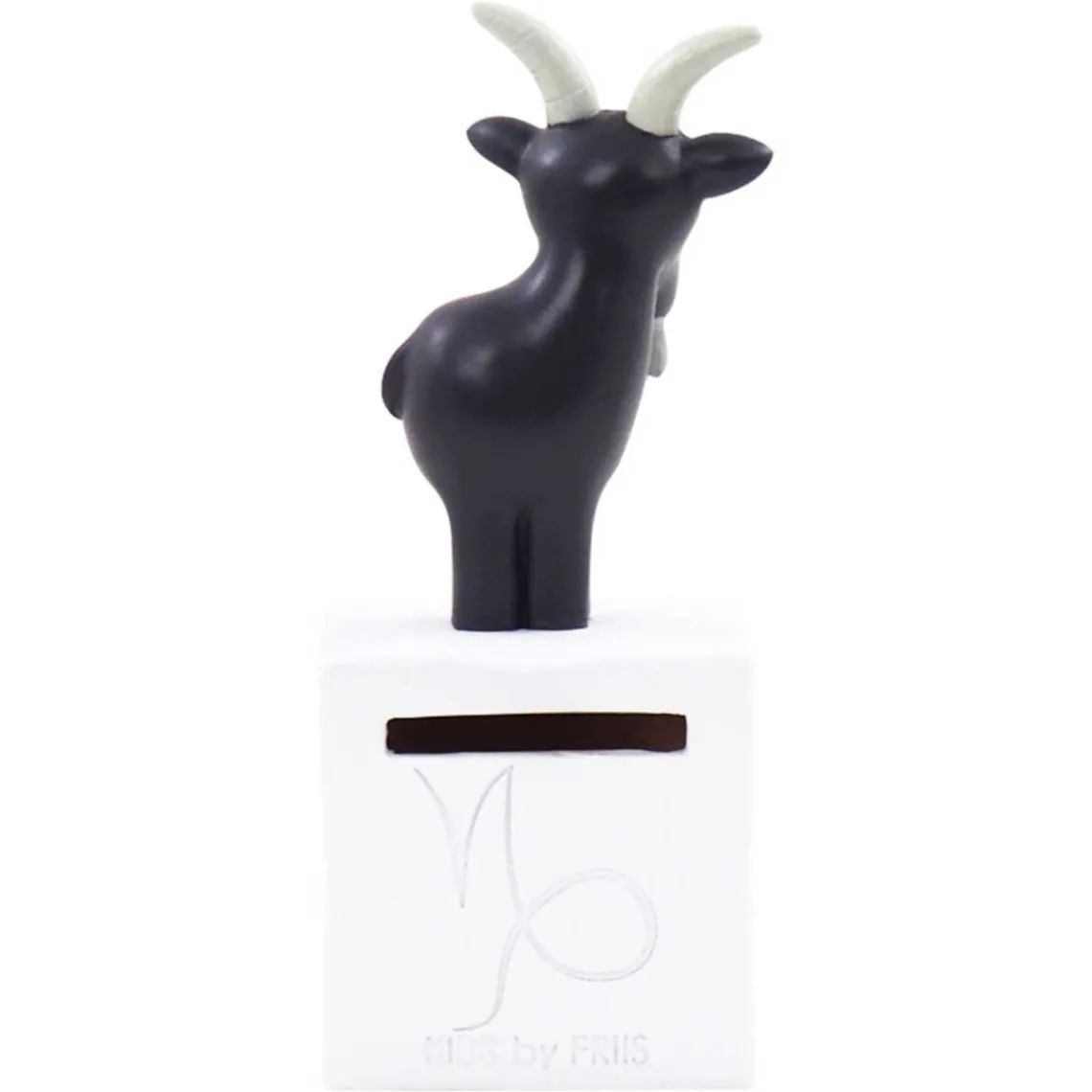 Sparebøssen ligger i den hvide kube som har en charmerende figur på toppen. Denne figur symboliserer Stenbuk i stjernetegn. På forsiden kan du læse 6 søde egenskaber om stjernetegnet, mens bagsiden har indgravering stjernetegnets zodiac-symbol samt en horisontal pengesprække. I bunden findes det praktiske drejelåg, der gør det nemt at tømme bøssen for mønter.