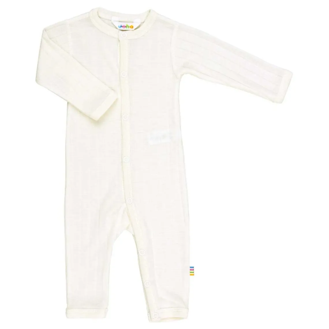 Sparkedragt fra Joha. Dette er en super lækker og skøn sparkedragt, som er fremstillet i uld og silke. Denne sparkedragt er med trykknapper fra halsen og helt ned, så den er nem at give barnet på.