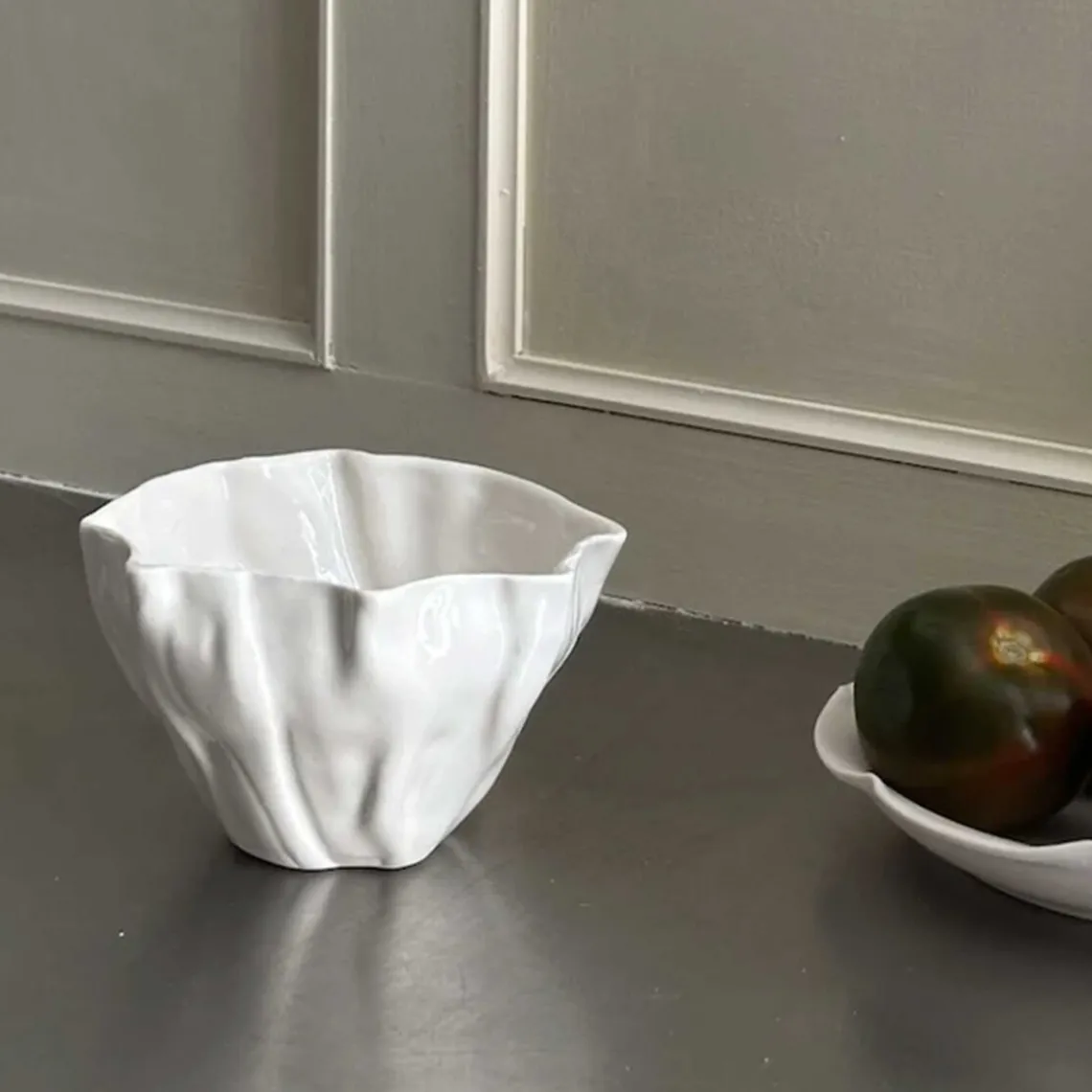 Overfladen er inspireret af den bølgede sandbund, som opstår, når vandet trækker sig tilbage og blotter den nøgne havbund – et sanseligt og naturligt udtryk fra et foranderligt landskab. Da koppen er håndlavet, kan der forekomme små variationer fra kop til kop, hvilket gør hver enkelt unik. Materiale: porcelæn