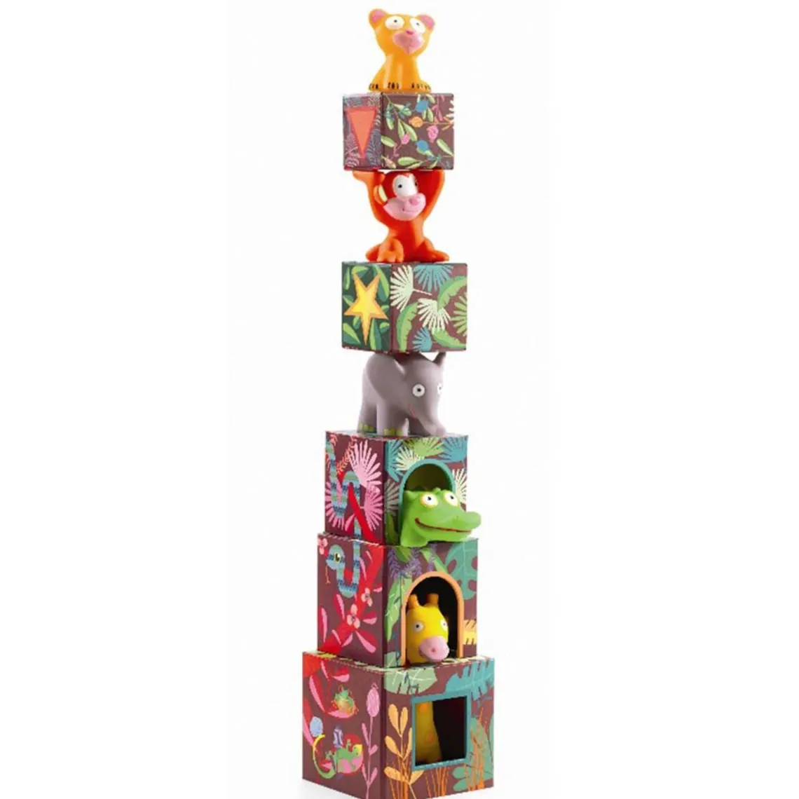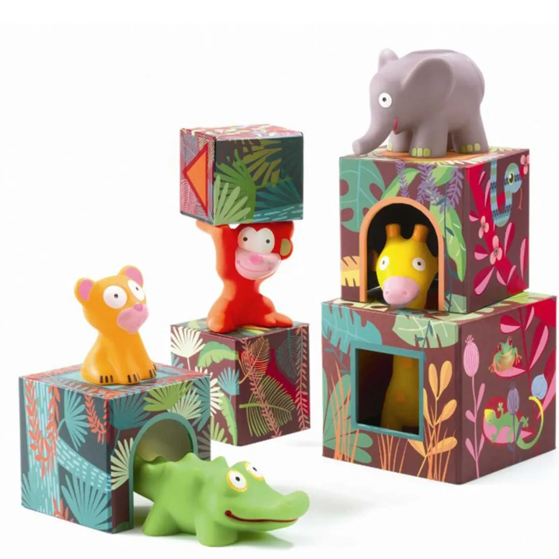 De farverige klodser er smukt dekoreret med jungletema og er lavet, så de kan stables til små “huler” – perfekt som hjem for de fem medfølgende plastikdyr. Dette sæt er ideelt til de mindste: klodserne kan stabiles, gemme dyrene og skabe lege der støtter rolleleg samt tidlig motorisk udvikling.