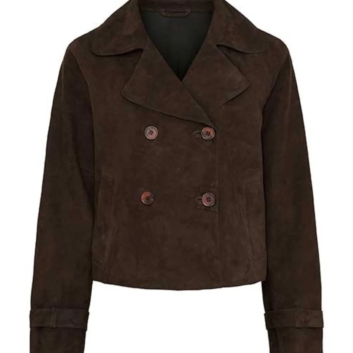 Elegant kort trenchcoat i blødt ruskind-look. Jakken har en klassisk krave, knaplukning foran og et stilrent design, der gør den nem at style til både hverdag og fest. En tidløs favorit, der kombinerer komfort og raffineret stil.